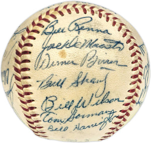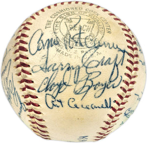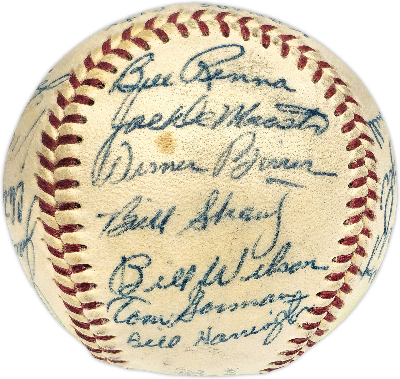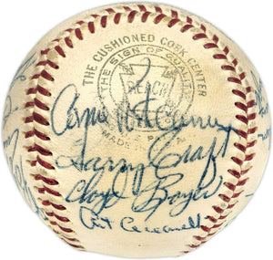 This is an Official Harridge AL Baseball that has been hand signed by members of the 1955 Kansas City A's Team. Includes Enos Slaughter. Also signed by Vic Power, Jack Littrell, Clete Boyer, Vic Rasci, John Sain, Art Ceccarelli, Harry Craft, Cloyd Boyer, Arnnie Portocarrero, Bill Renna, Joe DeMaestri, Bill Wilson, Tom Gorman, Bill Harrington, Bill Shantz, Jim Finnigan, Bobby Shantz, Elmer Valo, Gus Zernial and one other. There is toning in the item as shown. This item has been certified authentic by Beckett Authentication (BAS) and comes with their tamper-proof hologram and matching full-page certificate of authenticity.