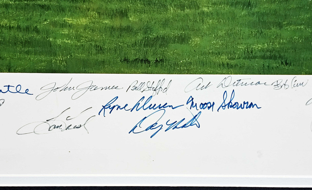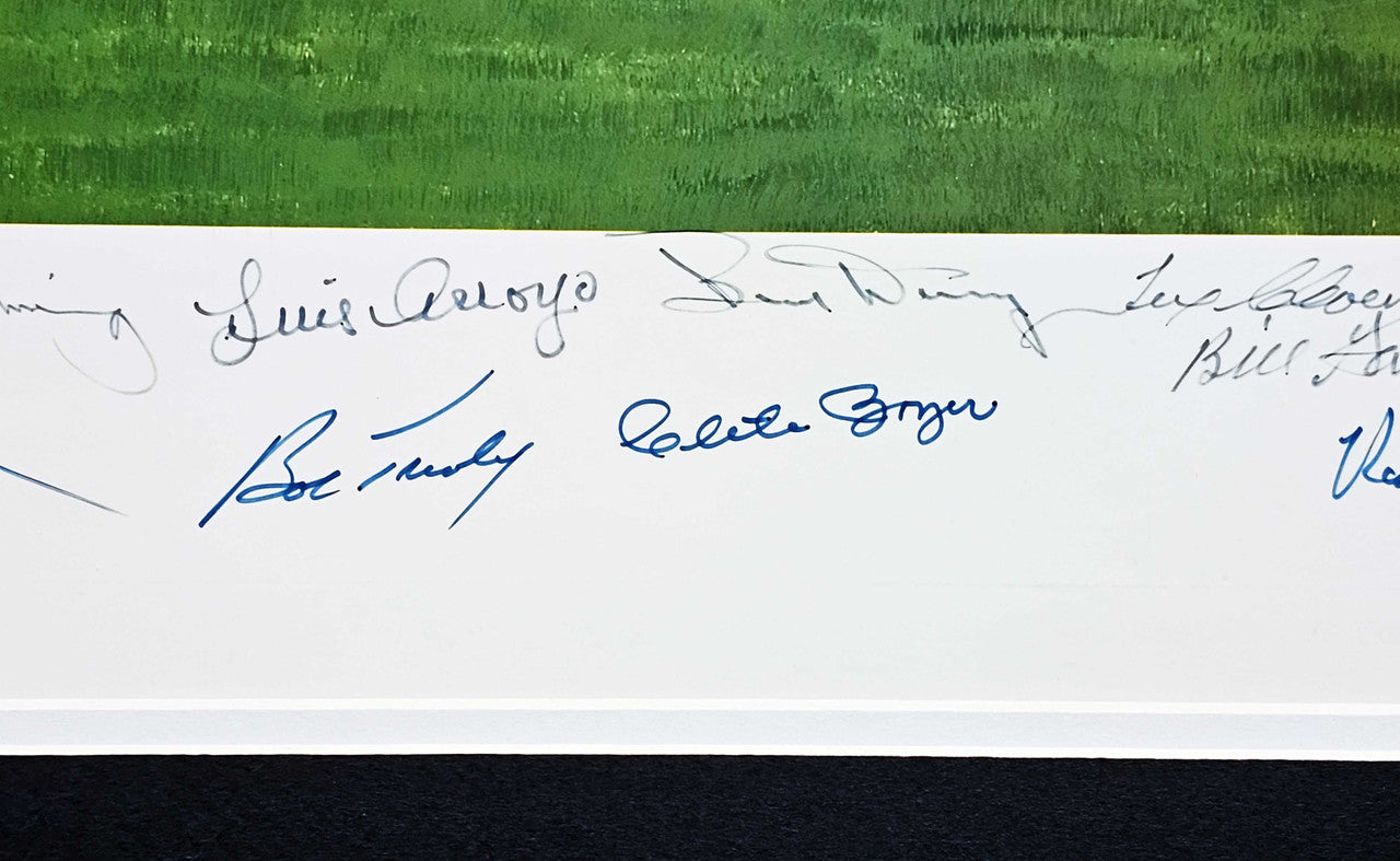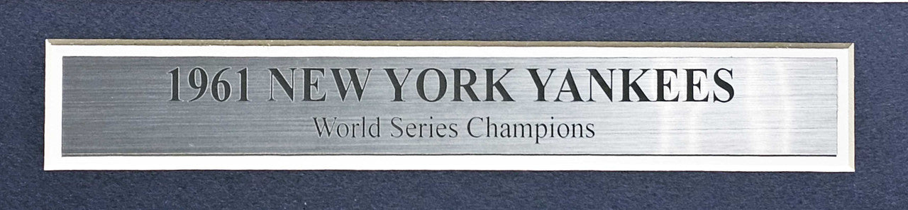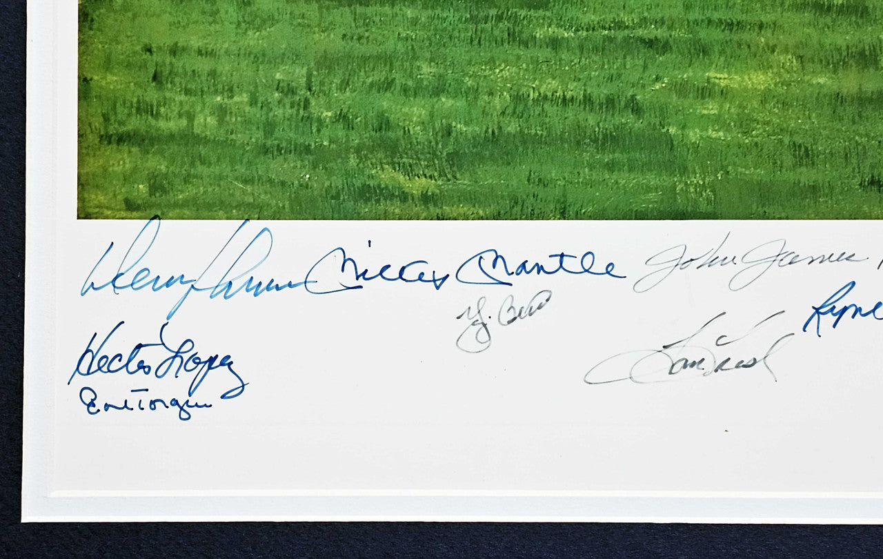 This is a Framed 24x36 Lithograph Photo, approximately 33x44 with the frame, that has been hand signed by 34 members of the 1961 New York Yankees. These members are: MICKEY MANTLE, YOGI BERRA, WHITEY FORD, BOB TURLEY, RALPH HOUK, BOBBY RICHARDSON, JOHNNY SAIN, BILL SKOWRON, RALPH TERRY, TOM TRESH, EARL TORGESON, DERON JOHNSON, LUIS ARROYO, JOHNNY BLANCHARD, CLETE BOYER, BOB CERV, TEX CLEVENGER, JIM COATES, BUD DALEY, JOE DeMAESTRI, ART DITMAR, AL DOWNING, RYNE DUREN, BILL GARDNER, JESSE GONDER, BOB HALE, JOHNNY JAMES, RON LEWIS, HECTOR LOPEZ, DANNY McDEVITT, JACK REED, HAL RENIFF, ROLLIE SHELDON, BILL STAFFORD. The lithograph photo comes with the artist's signature as well. This is a limited edition item that has been serial numbered #535/1000. This item has been certified authentic by PSA/DNA and comes with their Tamper-Proof Hologram and matching full-page certificate of authenticity.