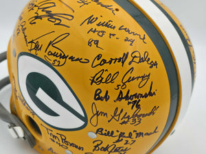 Celebrate NFL history with this extraordinary 1966 Green Bay Packers Team Signed Yellow Full-Size Replica Helmet. Featuring 32 authentic signatures from members of the legendary Super Bowl I Champion Packers, this helmet is a rare treasure for die-hard fans and collectors. Authenticated by Beckett Authentication Services (BAS), it includes their tamper-proof hologram and full-page Certificate of Authenticity.