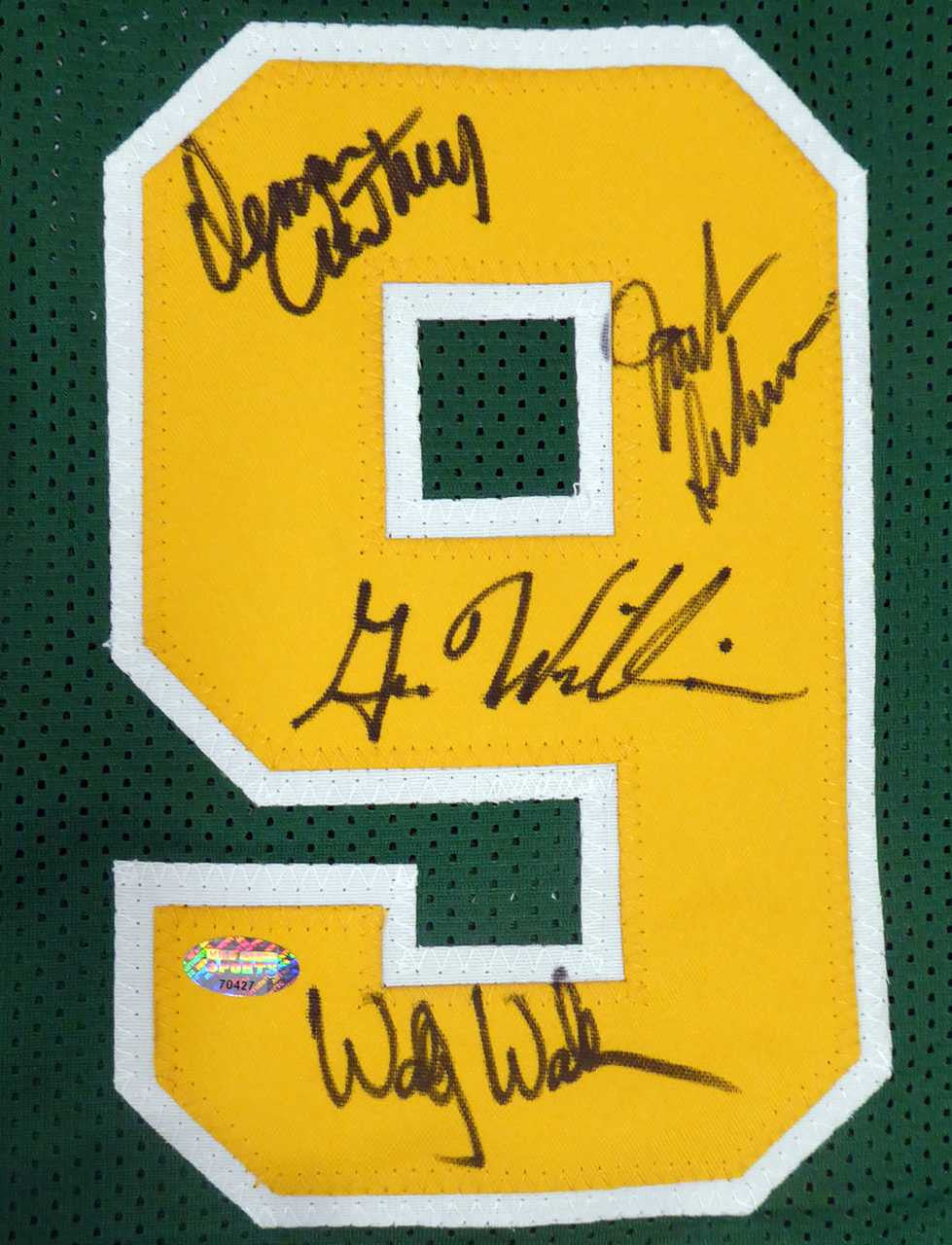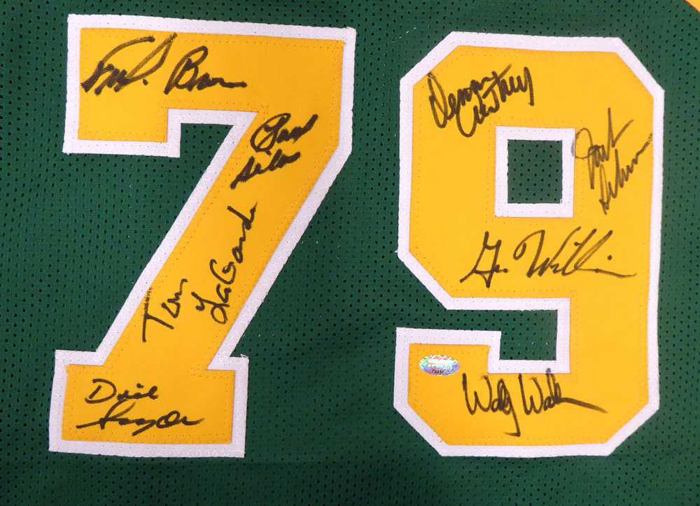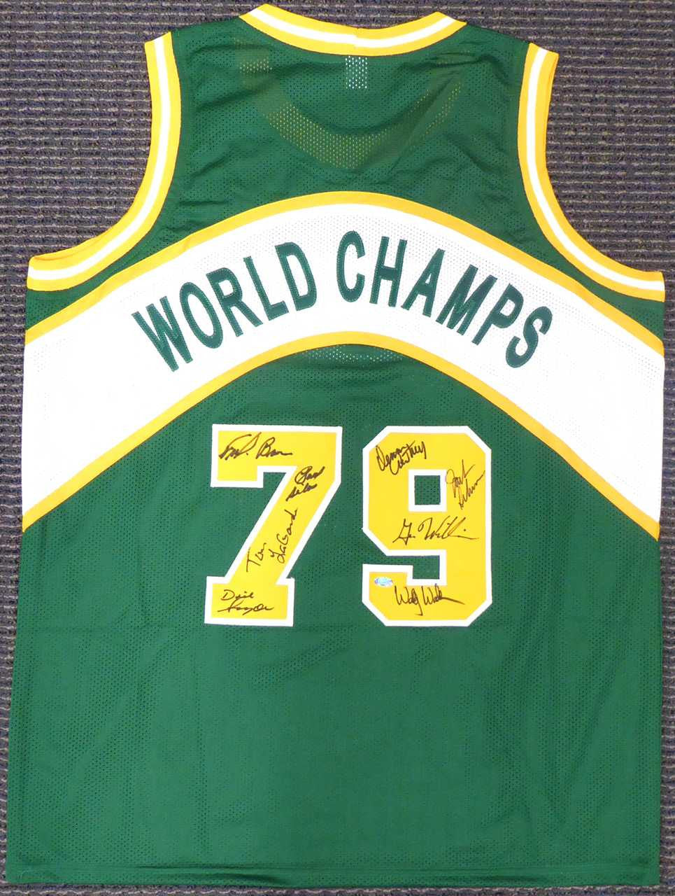 This is a Custom Jersey that has been hand signed by 8 members if the 1978-79 NBA Champions Seattle Supersonics. Signatures include Fred Brown, Gus Williams, Jack Sikma, Paul Silas, Wally Walker, Dennis Awtrey, Dick Snyder & Tom LaGarde. This is a custom jersey with no name brand. The approximate size is XL. It has nice sewn in name and numbers. This item was signed in the presence of a Mill Creek Sports representative and comes with their serial numbered hologram and matching certificate of authenticity. We have a few of these in stock. Autograph size and location may vary, but will be of equal quality.