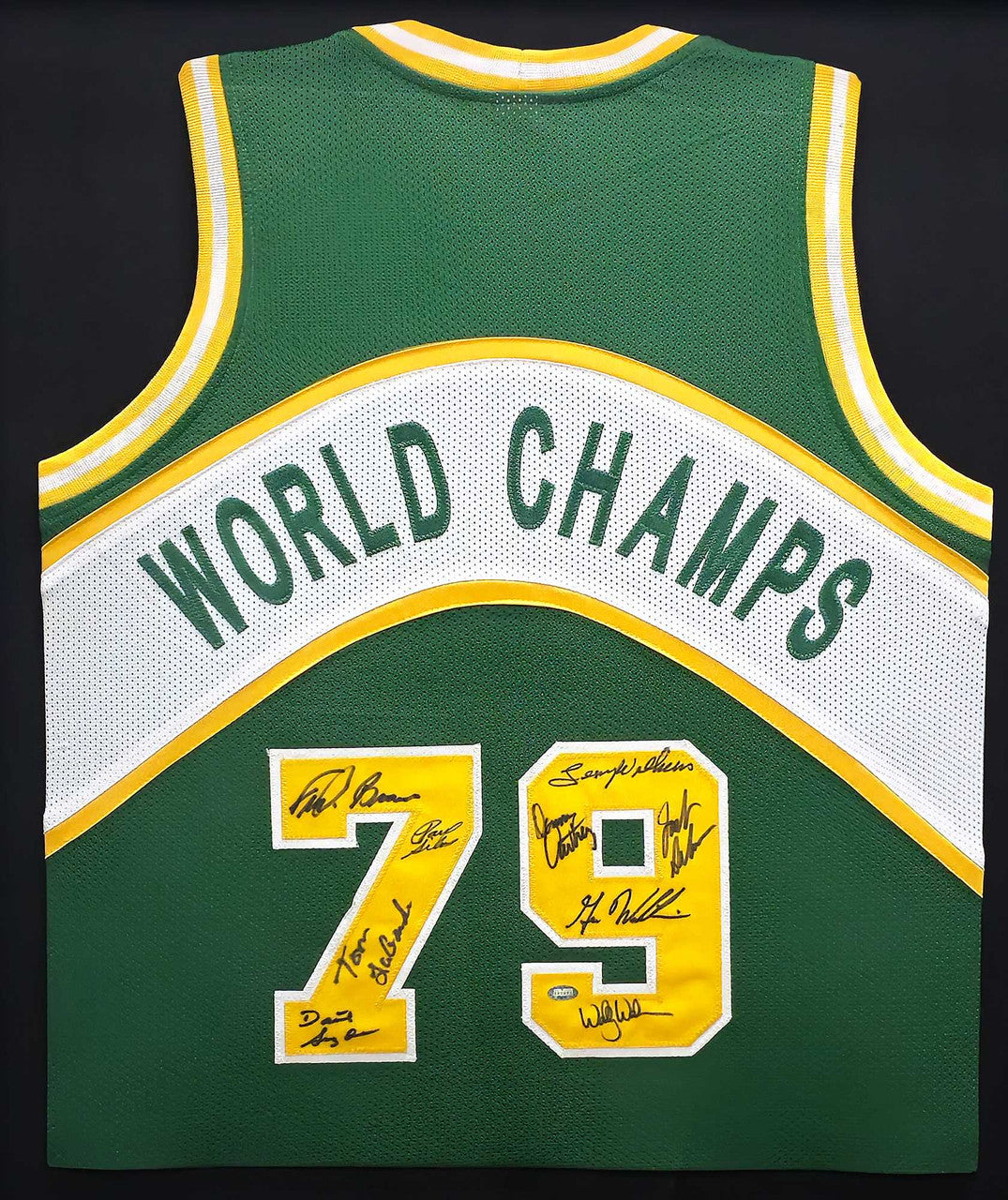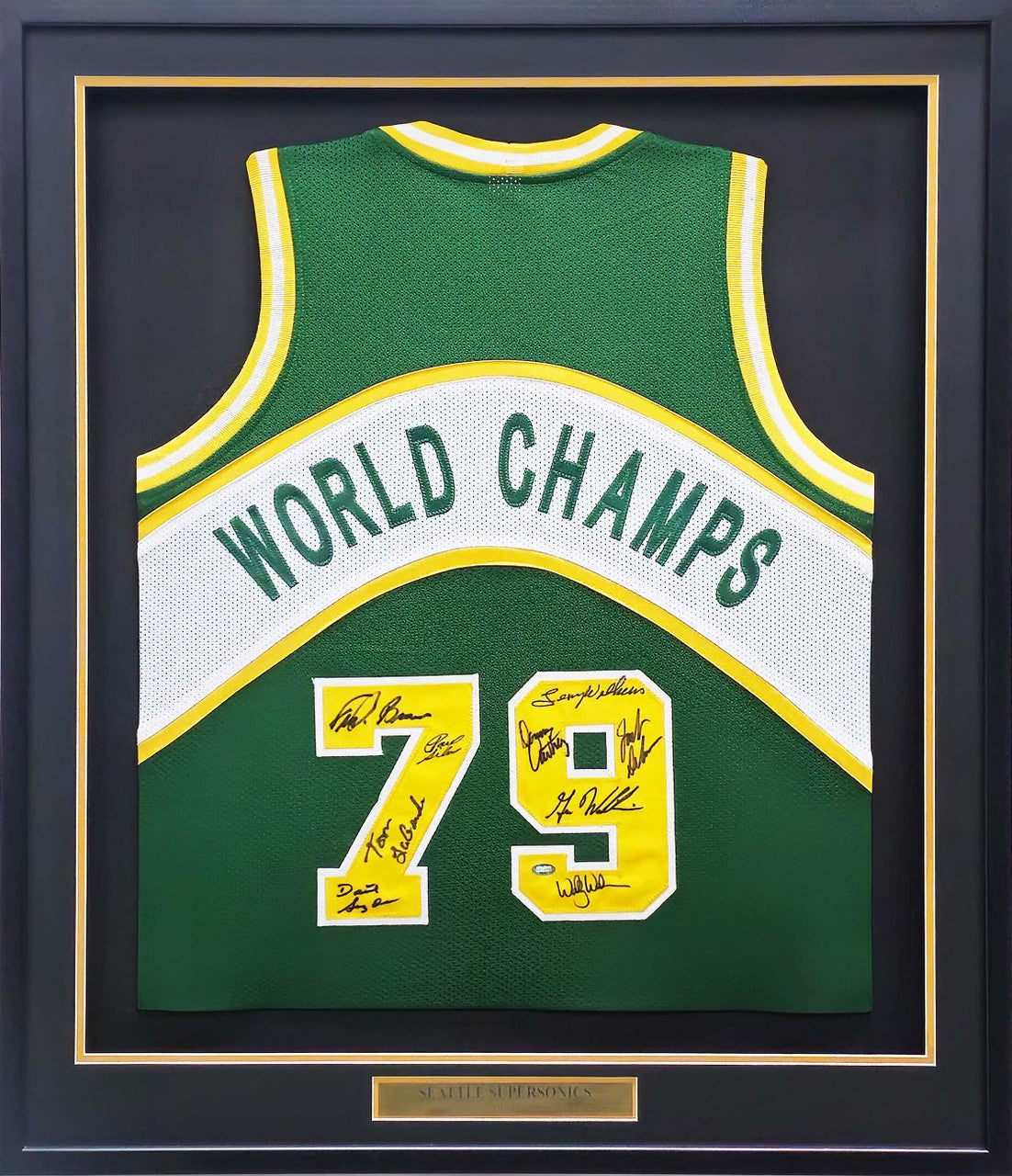1978-79 Seattle SuperSonics NBA Champions Team Signed Framed Green Jersey – 9 Signatures – MCS Holo