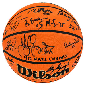 1990 UNLV Runnin' Rebels team signed Wilson NCAA game replica basketball with '90 Nat'l Champs' inscription. This team basketball is autographed by 13 members of the 1990 UNLV men's basketball national championship team and signatures include: Larry Johnson, Stacey Augmon, Greg Anthony, David Butler, Stacey Cvijanovich, Anderson Hunt, Travis Bice, Bryan Emerzian, Dave Rice, Barry Young, James Jones, Moses Scurry and Chris Jeter. Item comes with a Schwartz Sports Memorabilia tamper-proof numbered hologram and Certificate of Authenticity which can be verified online.
