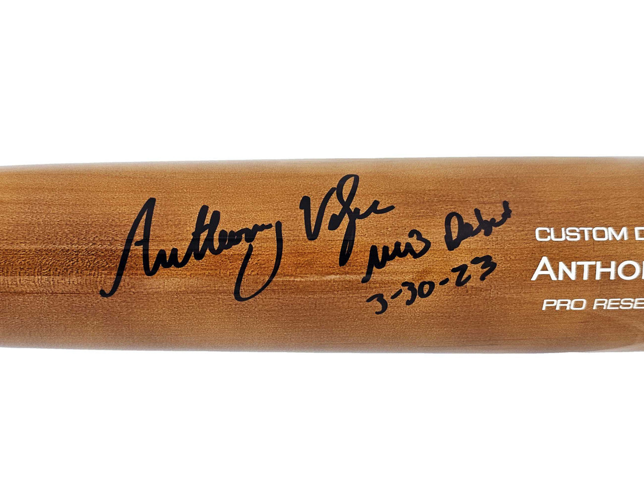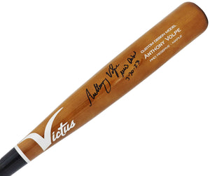 This is a Brown Victus Player Model Bat that has been hand signed by Anthony Volpe. This item was inscribed "MLB Debut 3-30-23." This item has been certified authentic by Fanatics and comes with their tamper-proof sticker.