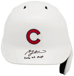 Ben Zobrist signed Chicago Cubs white Rawlings full size batting helmet with '2016 WS MVP' inscription. Item comes with a Schwartz Sports Memorabilia tamper-proof numbered hologram and Certificate of Authenticity which can be verified online.