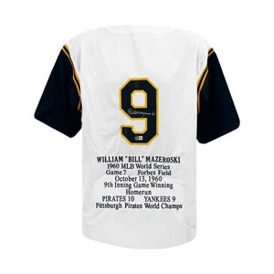Own a piece of baseball history with this Bill Mazeroski autographed Pittsburgh Pirates stats white jersey, authenticated by BAS. Mazeroski, a legendary second baseman, is best known for his iconic walk-off home run in the 1960 World Series. This custom jersey features Mazeroski's signature on the back, making it a must-have for any Pittsburgh Pirates fan. Made with high-quality materials, this jersey showcases Mazeroski's career statistics and comes with a certificate of authenticity. Add this Bill Mazeroski autographed jersey to your collection today and proudly display your love for the game and the Pittsburgh Pirates.