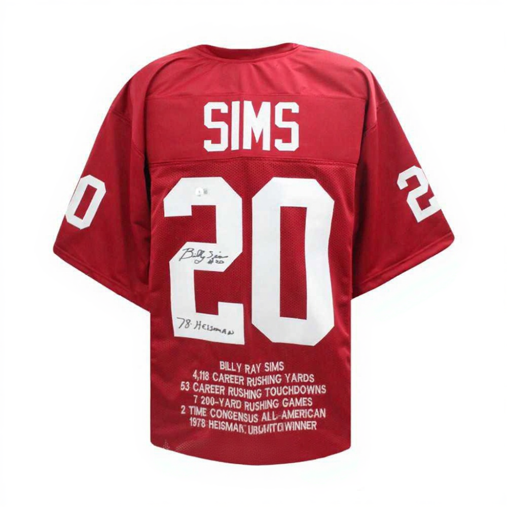 This Billy Sims signed Oklahoma Heisman jersey is a must-have collectible for Sooners fans and college football enthusiasts. Add this authenticated piece of NCAA history to your collection today!
