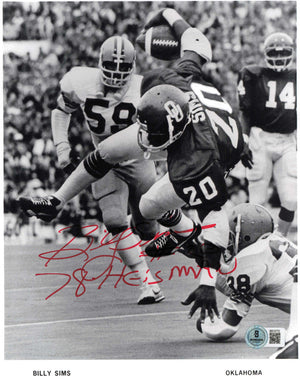 This is an 8x10 Photo that has been hand signed by Billy Sims. This item was inscribed "78 Heisman." This item has been certified authentic by Beckett Authentication (BAS) and comes with their tamper-proof QR Code hologram.