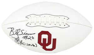 This premium Logo Brand white panel Oklahoma Sooners logo football has been hand-signed by Billy Sims with a clean, bold autograph and the “78 Heisman” inscription. The signature is authenticated by Schwartz Sports Memorabilia and includes their tamper-proof hologram and Certificate of Authenticity for lifetime verification.