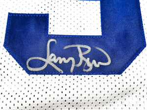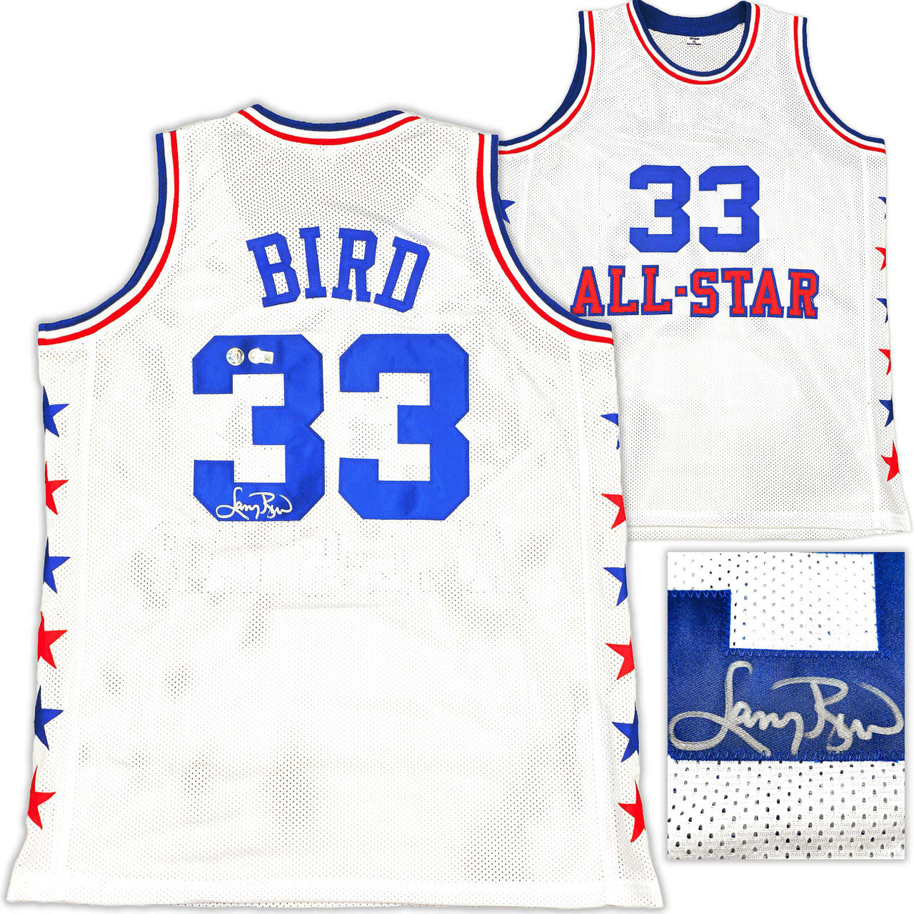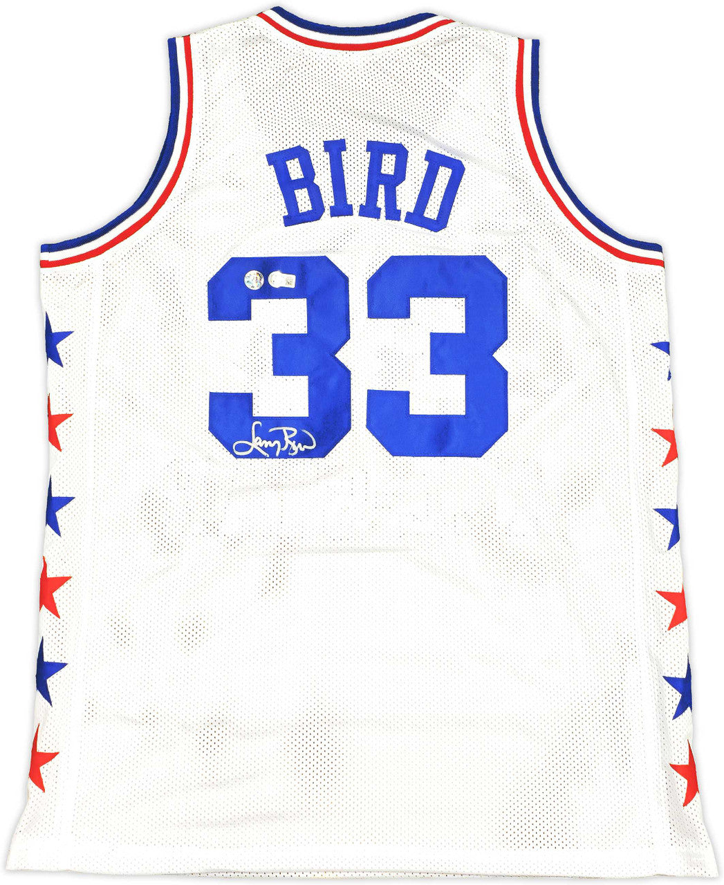 This is a White All Star Jersey that has been hand signed by Larry Bird. This is a custom jersey with no name brand. The approximate size is XL. It has nice sewn in name and numbers. This item has been witnessed and certified authentic by Beckett Authentication (BAS) and comes with their tamper-proof witness sticker.