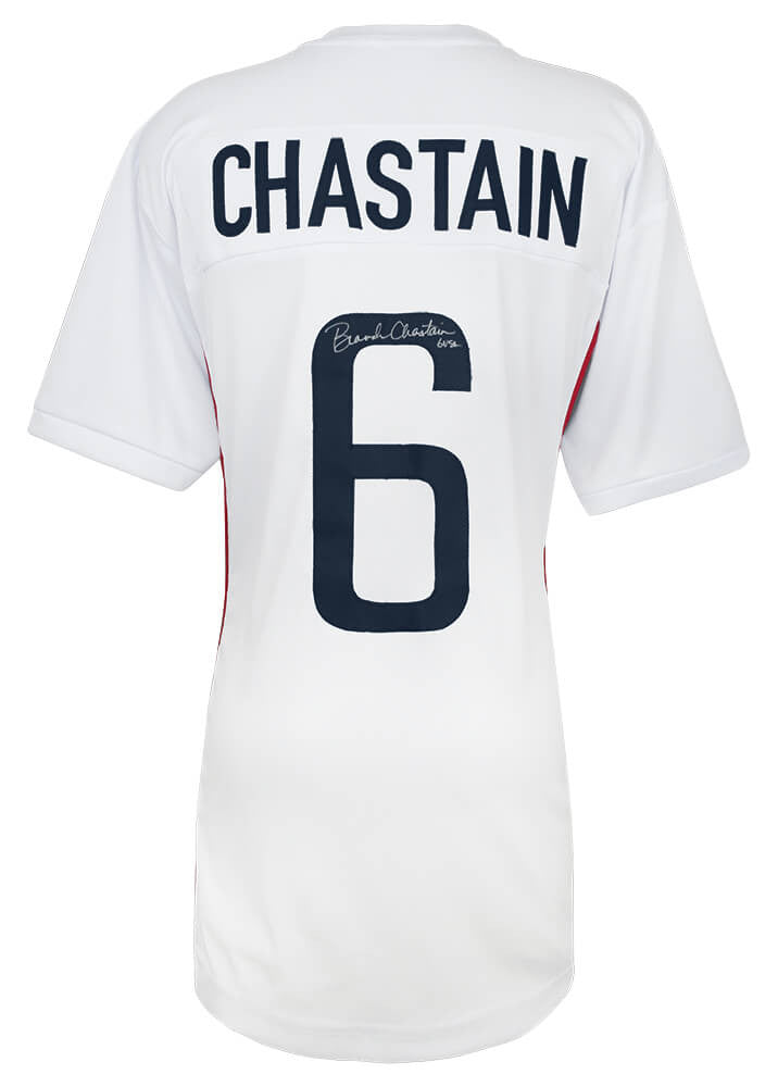 Brandi Chastain signed white custom soccer jersey. Item comes with a Schwartz Sports Memorabilia tamper-proof numbered hologram and Certificate of Authenticity which can be verified online.