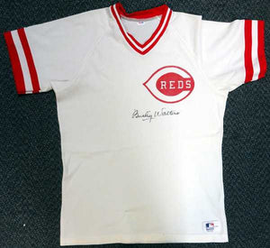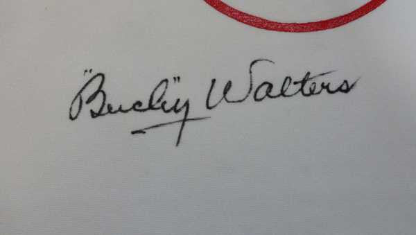 This is a Sand Knit Cincinnati Reds Jersey that has been hand signed by Bucky Walters. It has been certified authentic by PSA/DNA and comes with their sticker and matching full page certificate of authenticity. The jersey is a size L.
