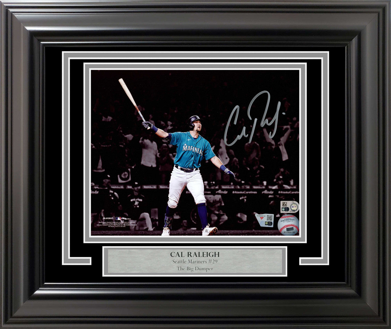 This framed 8x10 photograph has been hand signed by Cal Raleigh, whose legendary walk-off home run ended the Seattle Mariners’ historic playoff drought and instantly became one of the most celebrated moments in franchise history. Known affectionately as “Big Dumper”, Raleigh has cemented his place as a fan favorite and Mariners icon.