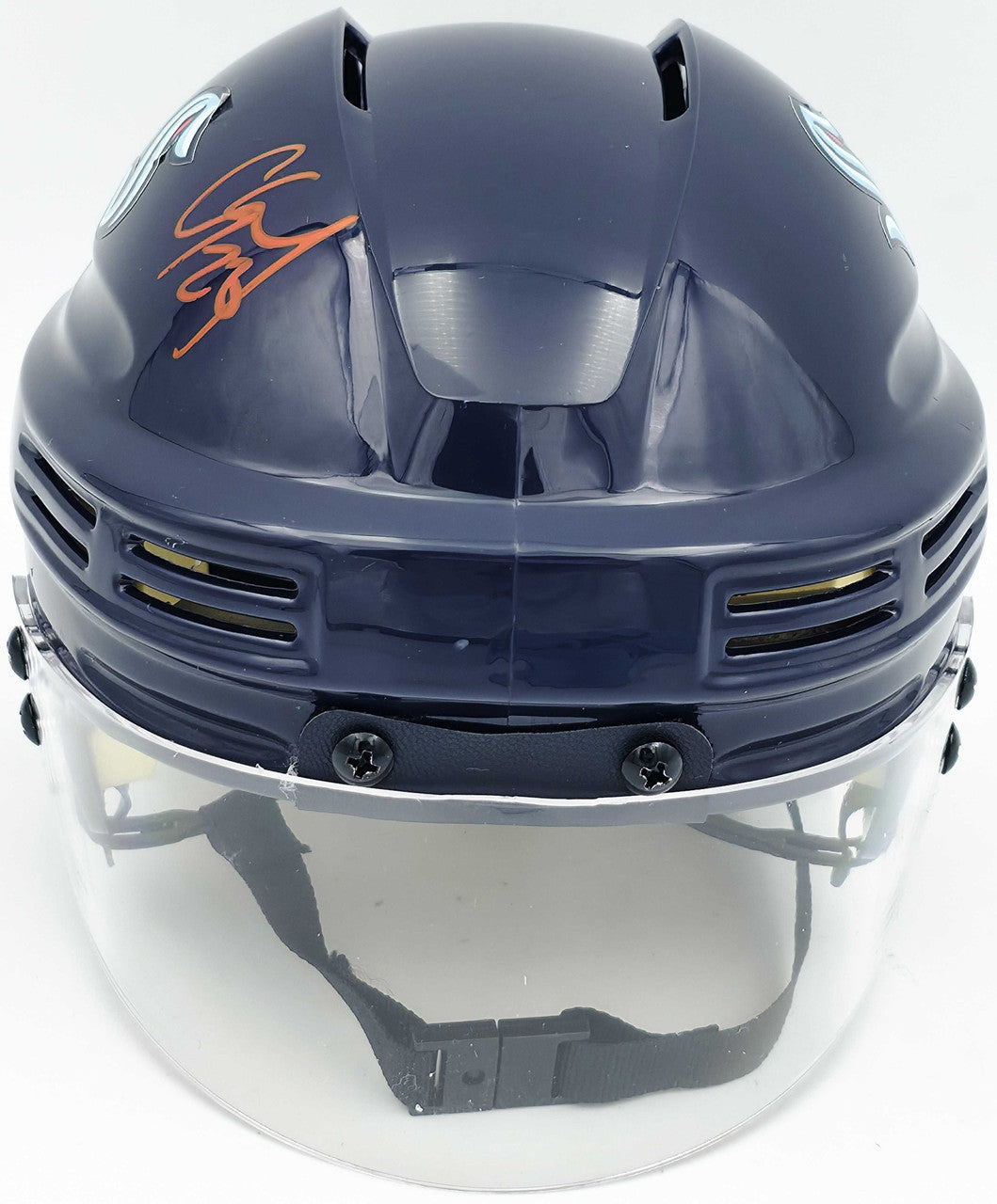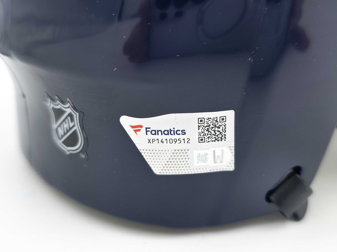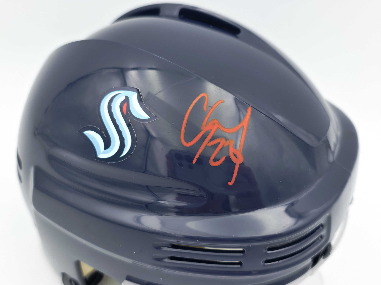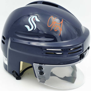 This is a Seattle Kraken Blue Speed Mini Helmet that has been hand signed by Carson Soucy. There is an imperfection in the signature as shown. This item has been certified authentic by Fanatics and comes with their tamper-proof hologram.