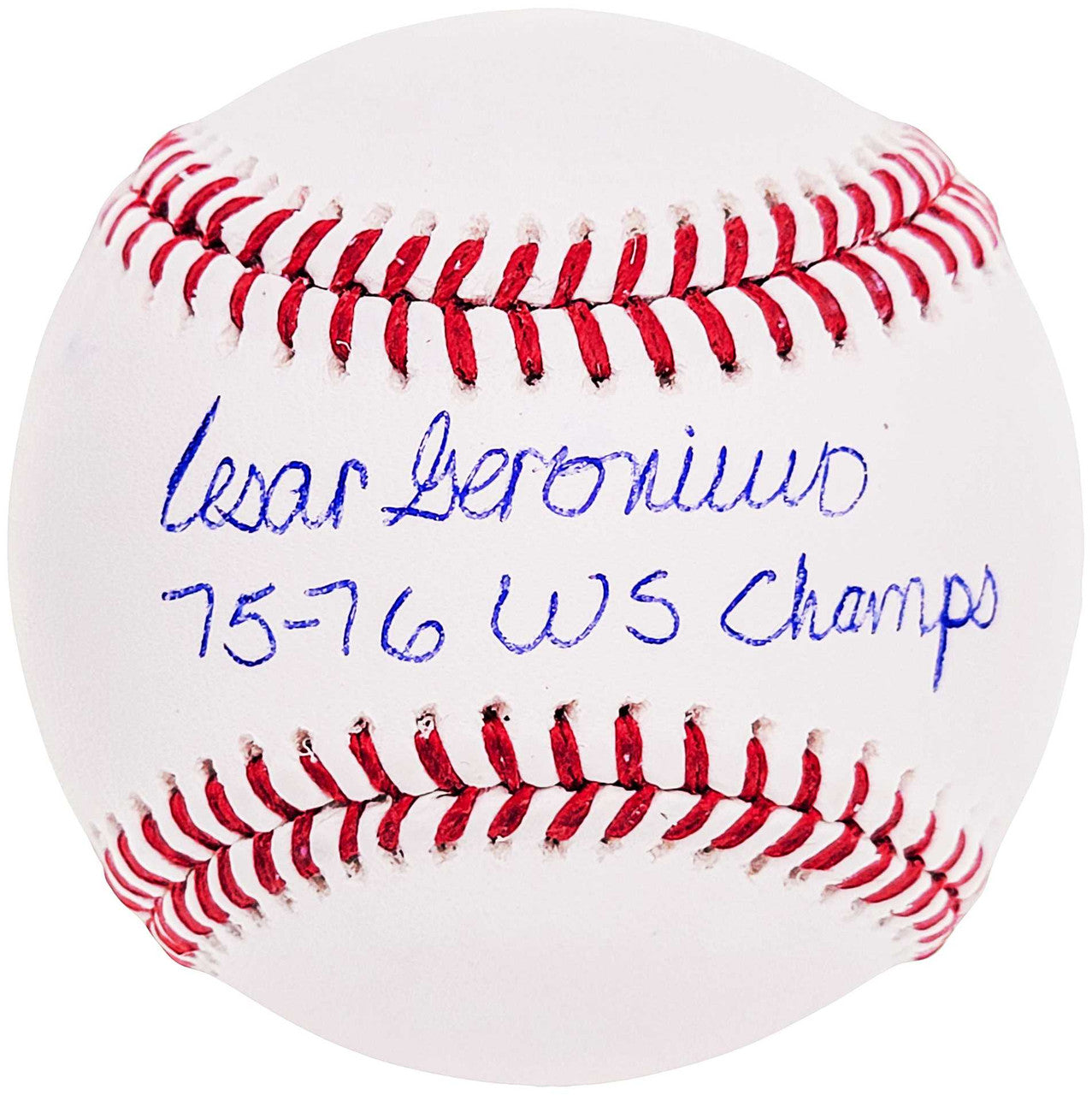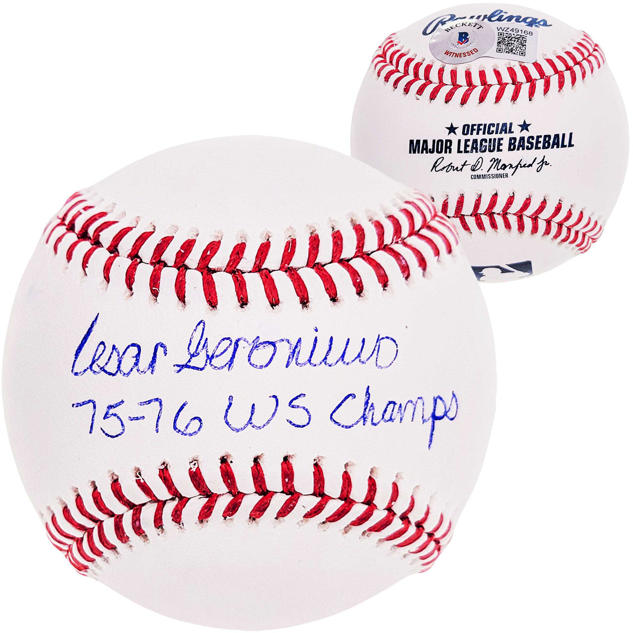 This is an Official MLB Baseball that has been hand signed by Cesar Geronimo. This item was inscribed "75-76 WS Champs." This item has been witnessed and certified authentic by Beckett Authentication (BAS) and comes with their tamper-proof witness sticker. Beckett Authentication has recently changed their physical certificate card policy where they no longer match their tamper-proof sticker with a physical certificate. A certificate can be printed on Beckett's website for the matching authentication number.