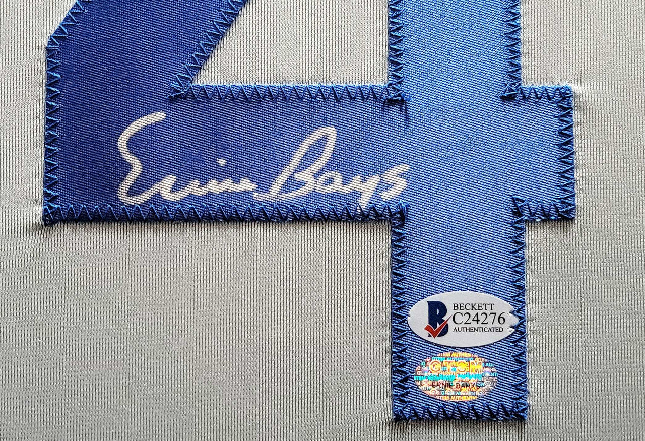 This is a framed Gray Jersey, approximately 31x36 with the frame, that has been hand signed by Ernie Banks. This is a custom jersey with no name brand. The approximate size is XL. It has nice sewn in name and numbers. This item has been certified authentic by Beckett Authentication (BAS) and comes with their tamper-proof sticker and matching certificate of authenticity.