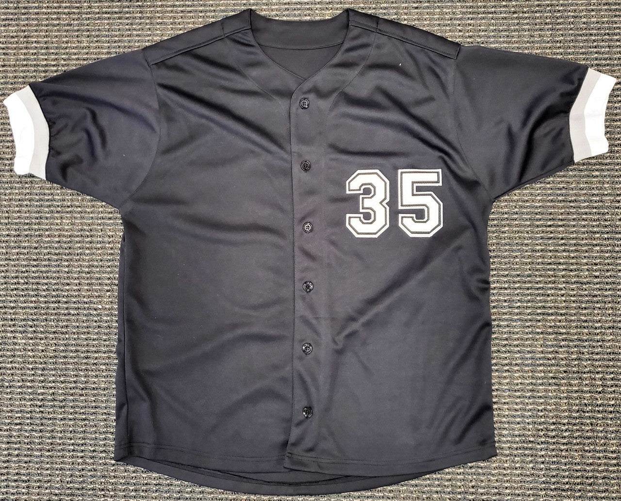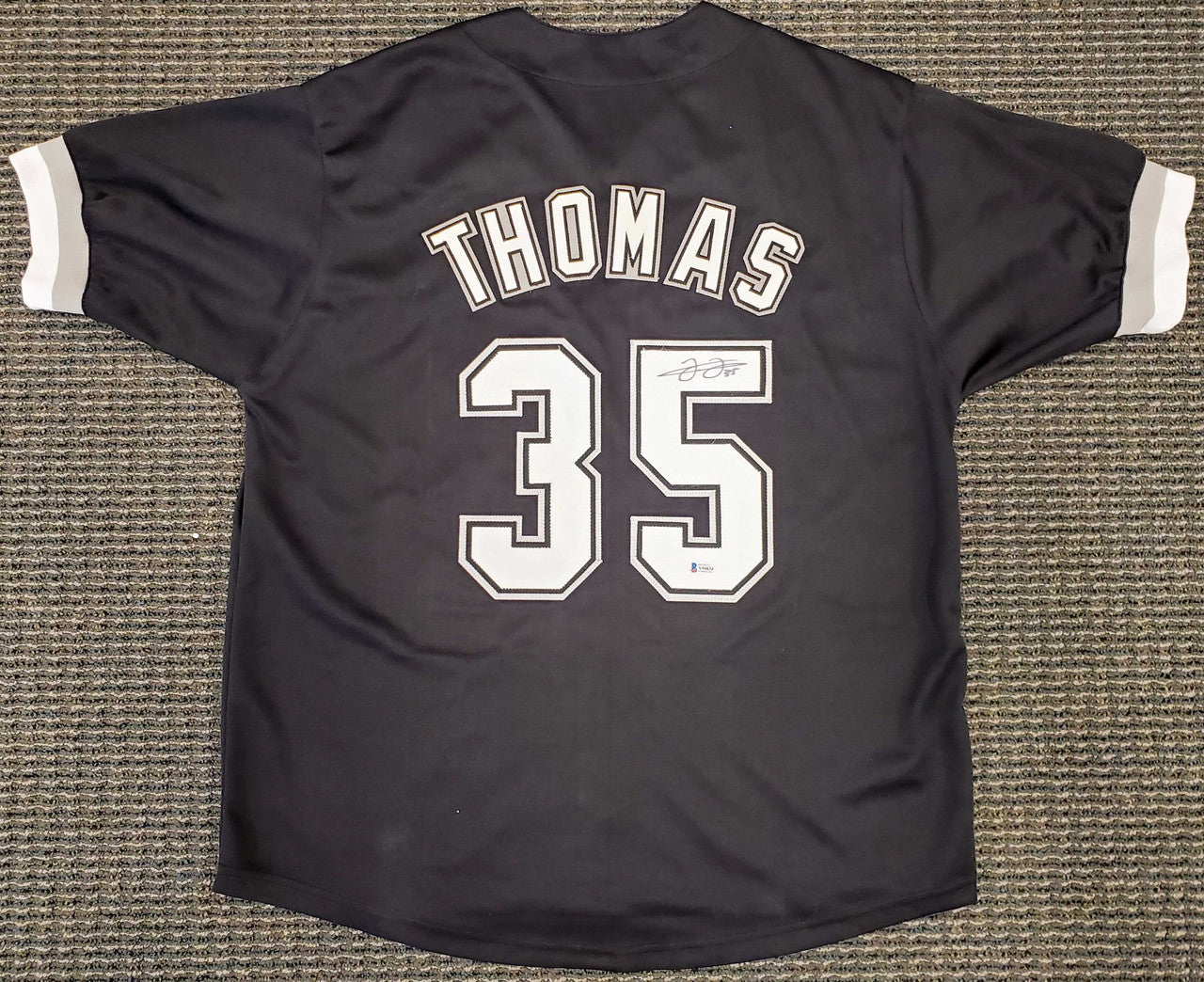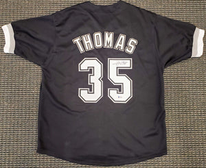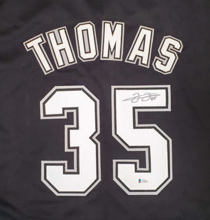 This is a Black Jersey that has been hand signed by Frank Thomas. This is a custom jersey with no name brand. The approximate size is XL. It has nice sewn in name and numbers. This item has been certified authentic by Beckett Authentication (BAS) and comes with their tamper-proof sticker and matching certificate of authenticity.