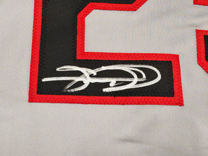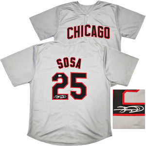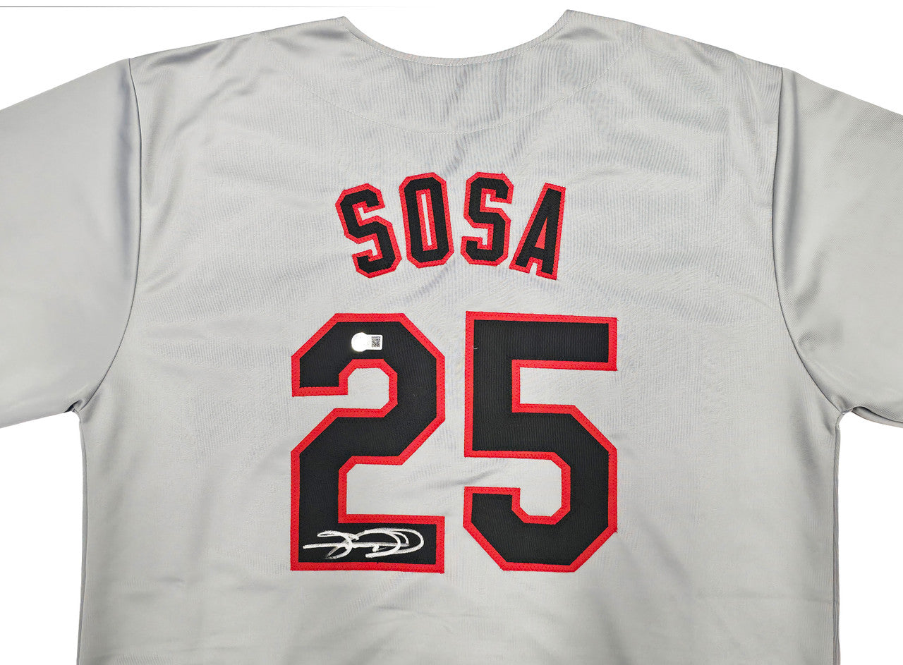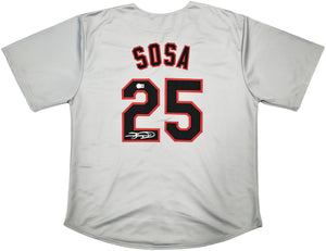 This is a Gray Jersey that has been hand signed by Sammy Sosa. This is a custom jersey with no name brand. The approximate size is XL. It has nice sewn in name and numbers. This item has been witnessed and certified authentic by Beckett Authentication (BAS) and comes with their tamper-proof witness hologram.