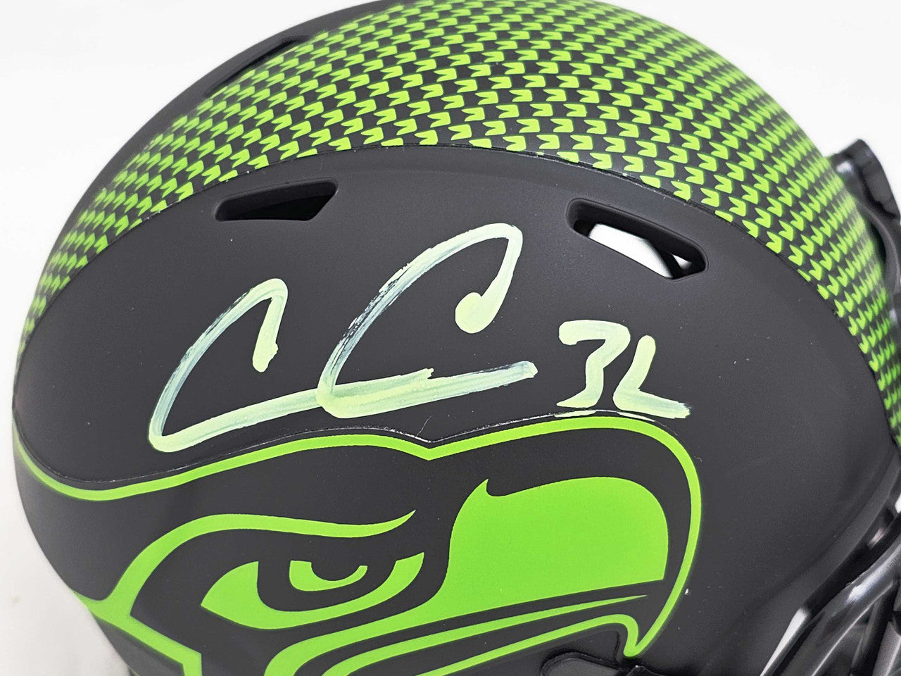 Own a premium mini helmet with this Chris Carson Autographed Seattle Seahawks Eclipse Black Speed Mini Helmet Fanatics Holo Stock #216809. Authenticated by Fanatics for guaranteed legitimacy.