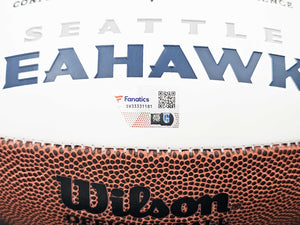 This is a Seattle Seahawks White Logo Football that has been hand signed by Chris Carson. This item has been certified authentic by Fanatics and comes with their tamper-proof sticker.