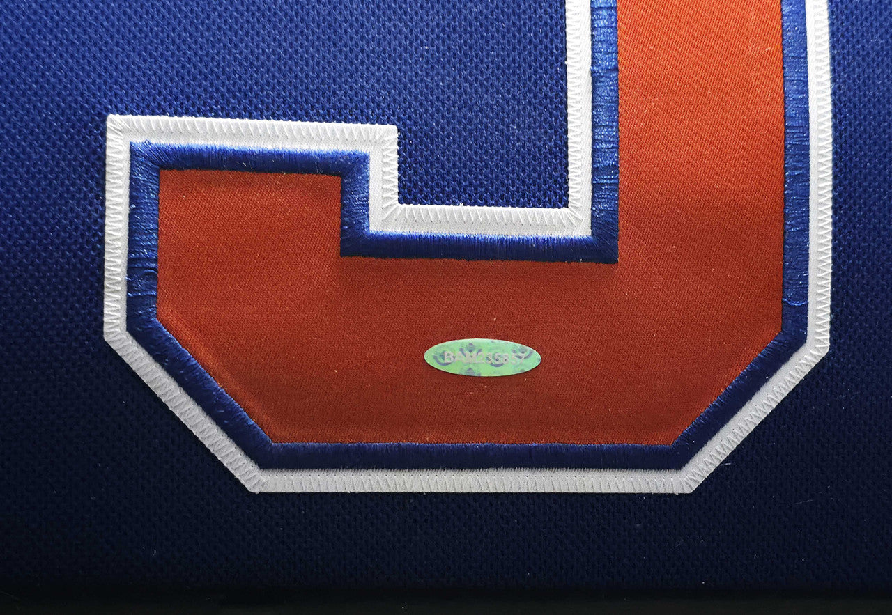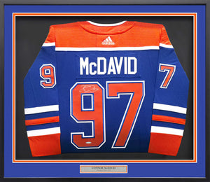 This official Blue Authentic Adidas Edmonton Oilers Jersey has been hand-signed by Connor McDavid with a bold, clean autograph. The jersey is professionally framed to a display-ready size of approximately 31x36, creating a stunning focal point for your home, office, or fan cave.