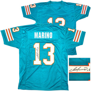 Add a Hall of Fame centerpiece to your memorabilia collection with this Dan Marino Signed Custom Miami Dolphins Teal Football Jersey. A 9× Pro Bowler, NFL MVP, and one of the greatest passers in league history, Dan Marino remains one of the most popular and collectible signatures in football.