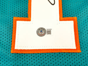 This vibrant Teal Custom Dolphins Jersey has been hand-signed by Dan Marino with a clean, bold autograph. Authentication is provided by Beckett Authentication Services (BAS) and features their modern QR-code hologram. Simply scan the code with any smartphone to instantly verify authenticity through the official Beckett database.