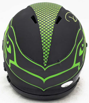 The autograph is prominently displayed on a striking Eclipse-style black Speed mini helmet, featuring a sleek, blackout design that offers strong contrast and premium visual appeal. Its compact size makes it ideal for desks, shelves, or any Seahawks fan cave display.