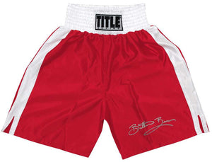 Eric 'Butterbean' Esch signed Title red with white trim boxing trunks. Item comes with a Schwartz Sports Memorabilia tamper-proof numbered hologram and Certificate of Authenticity which can be verified online.