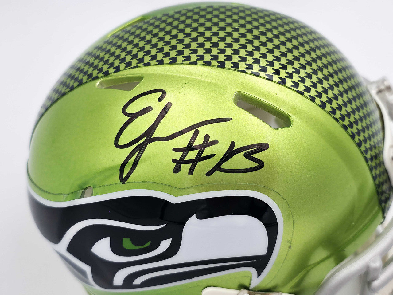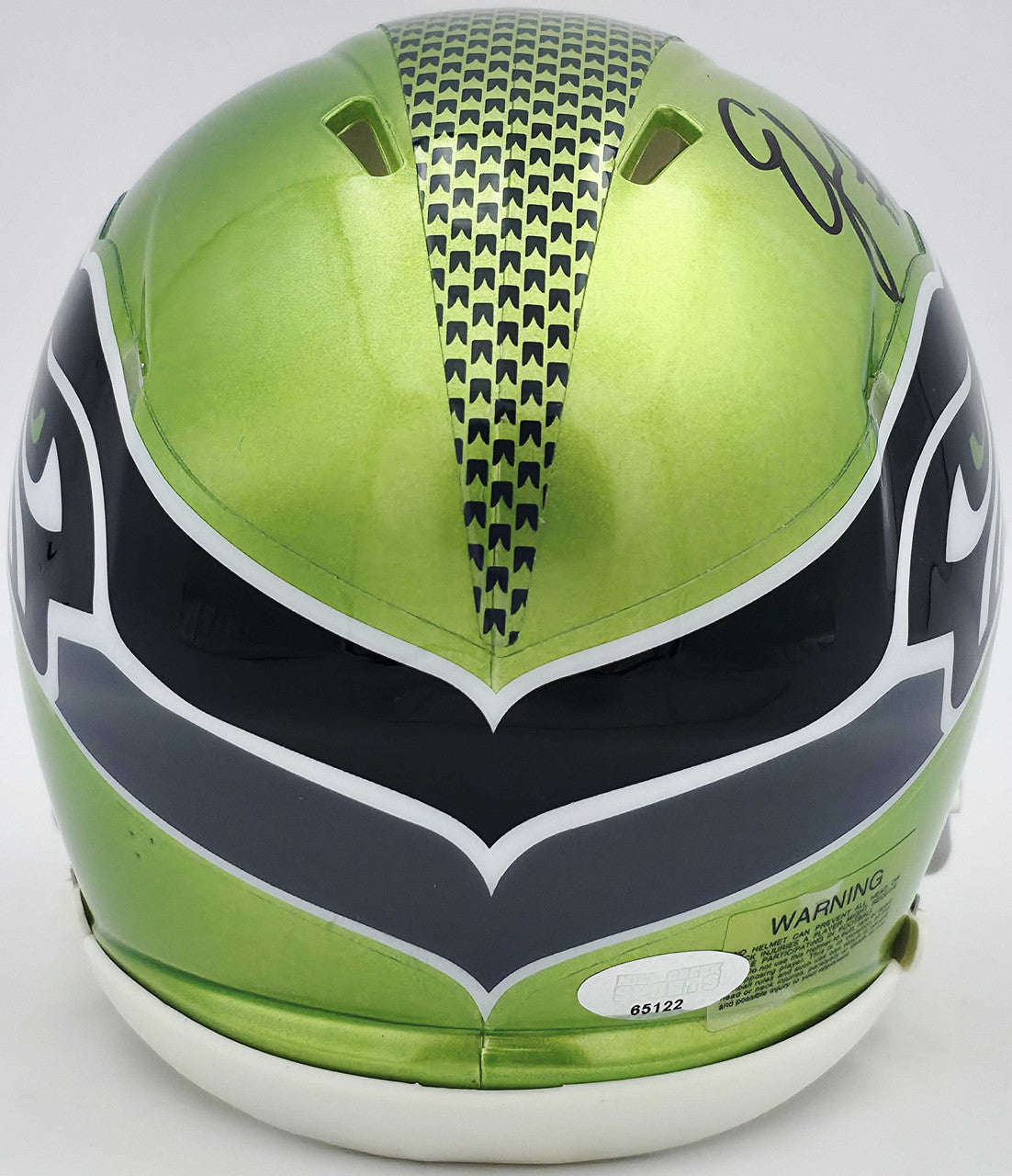 The autograph is prominently displayed on a sleek Speed-style mini helmet, offering a compact yet eye-catching display piece that’s perfect for desks, shelves, offices, or any Seahawks-themed memorabilia setup.