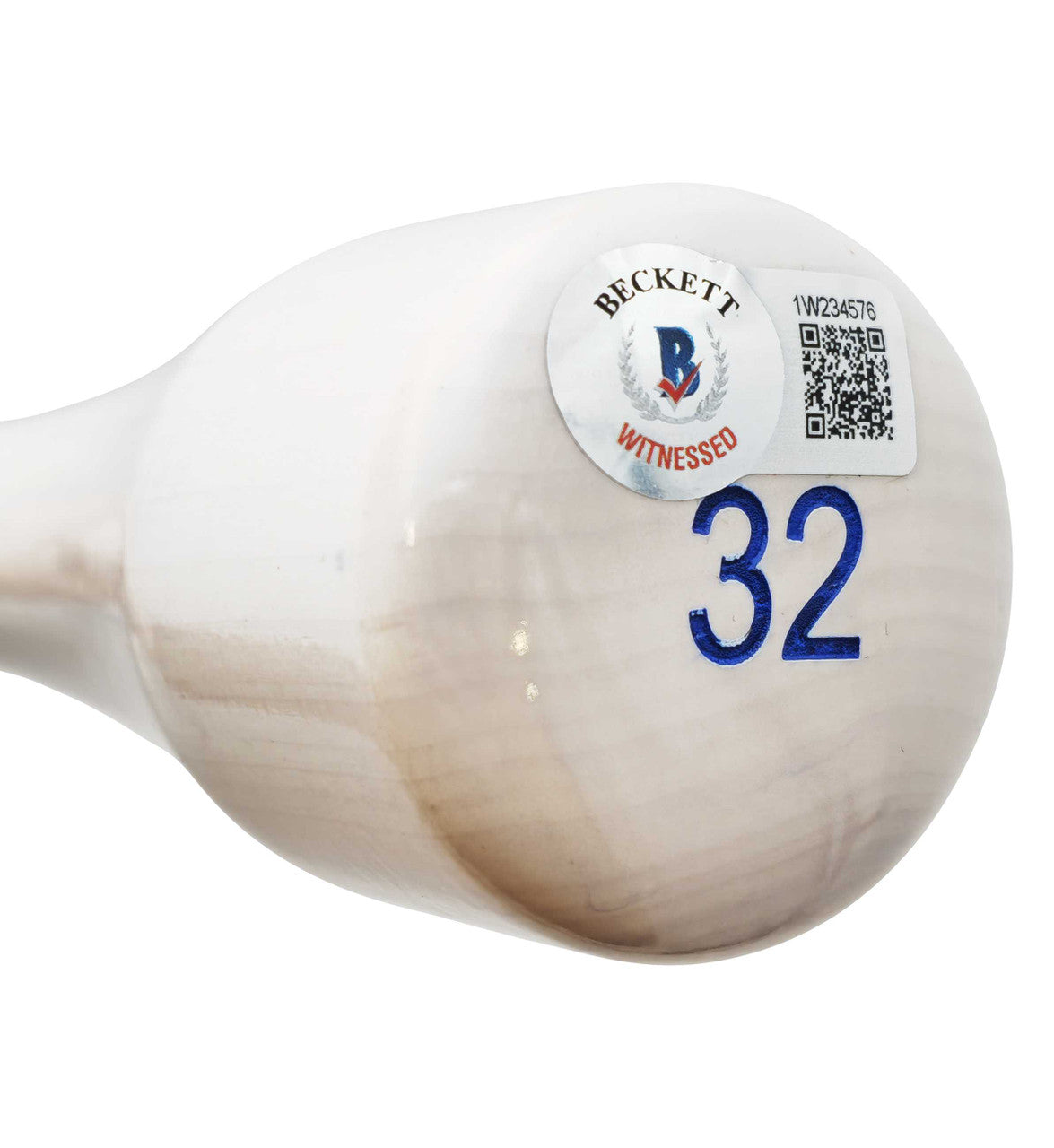 This is a Blue & White Marucci Player Model Baseball Bat that has been hand signed by Evan Carter. This item was inscribed "23 WS Champs." This item has been witnessed and certified authentic by Beckett Authentication (BAS) and comes with their tamper-proof witness sticker.