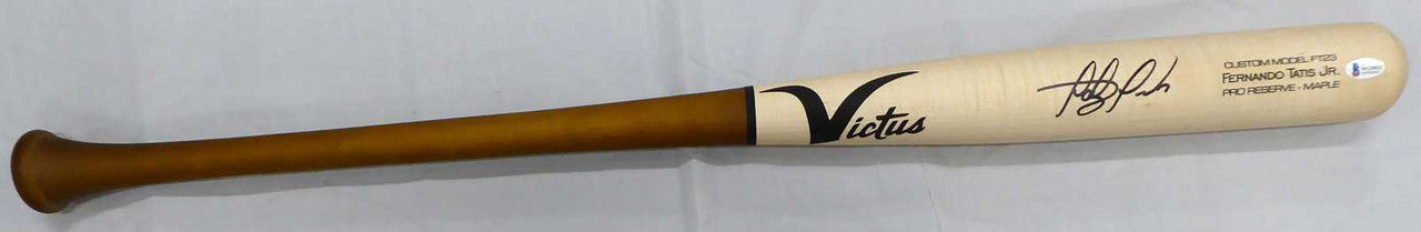 This is a Victus Game Model Bat that has been hand signed by Fernando Tatis Jr. This item has been certified authentic by Beckett Authentication (BAS) and comes with their sticker and matching certificate of authenticity.