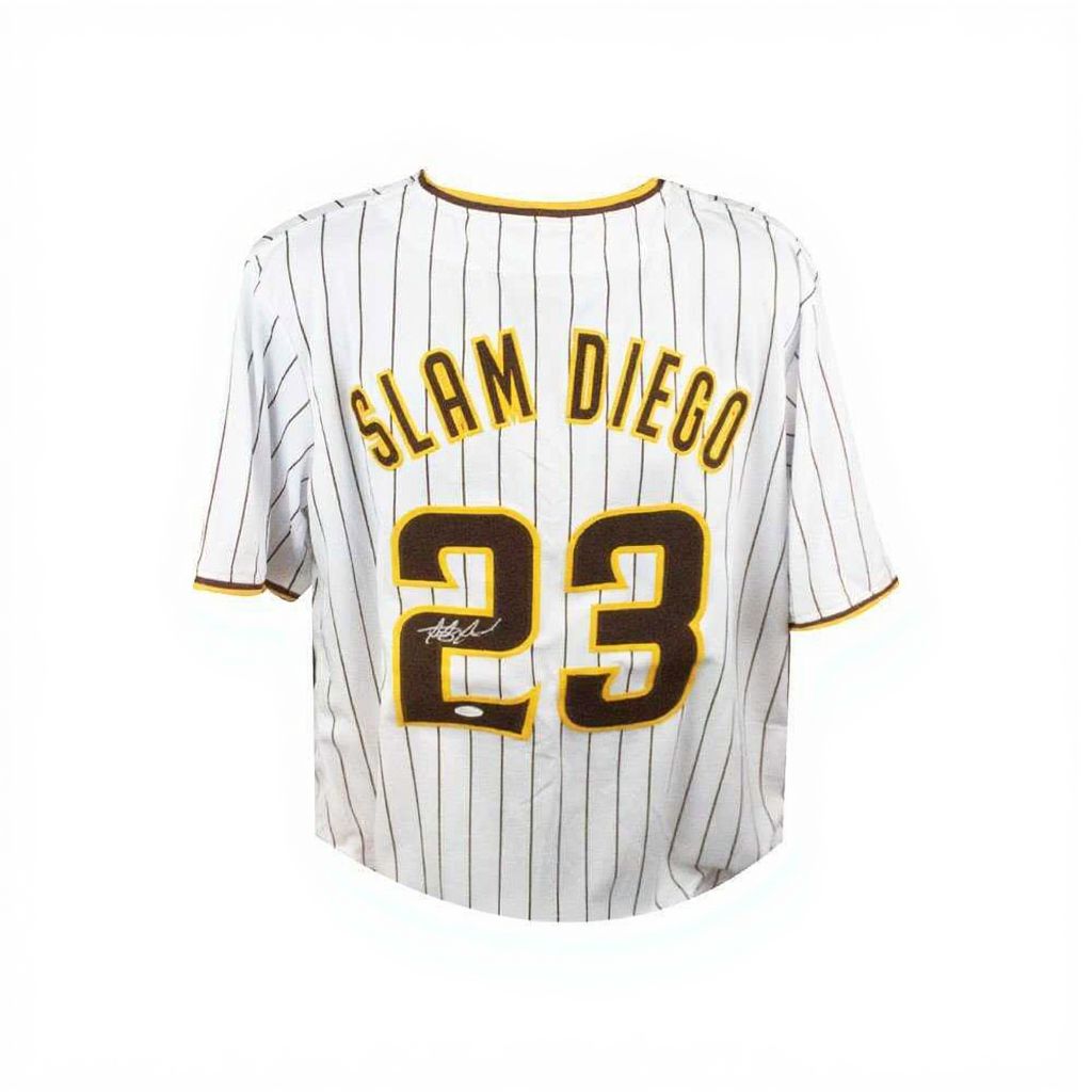 - Custom white pinstripe “Slam Diego” jersey
