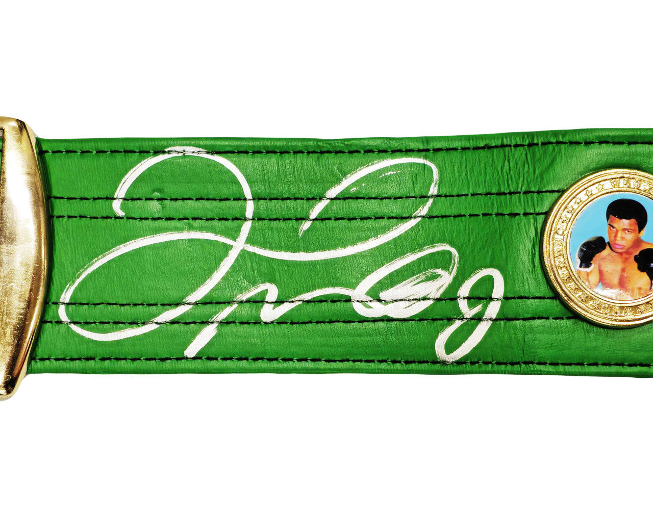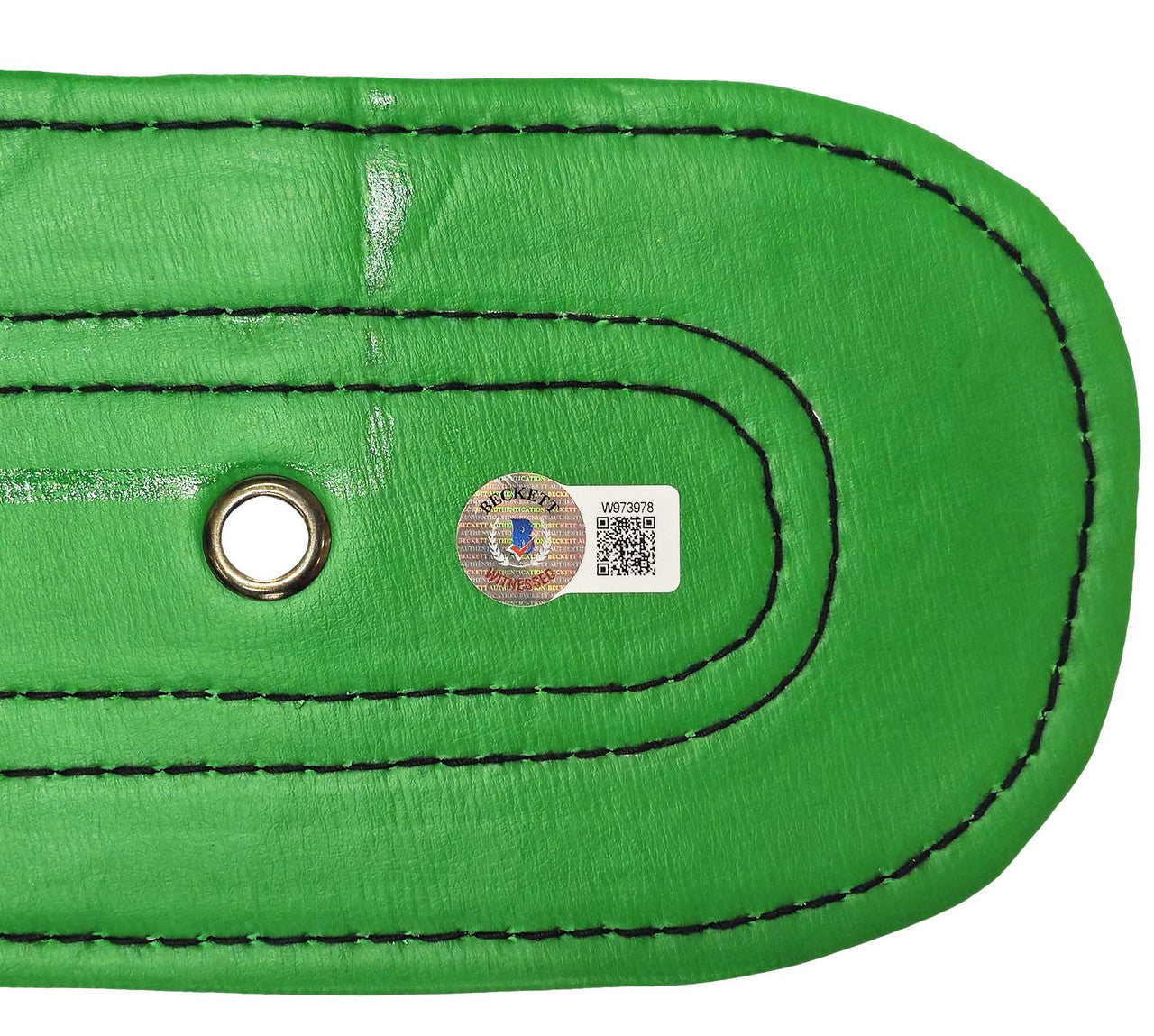 Add one of the most iconic boxing collectibles to your display with this Floyd Mayweather Jr. Autographed Green WBC World Championship Boxing Belt. This full-size belt measures approximately 48" long by 10" tall and has been hand-signed by Floyd Mayweather Jr., the undefeated, 50–0 boxing legend. The signature was witnessed and authenticated by Beckett Authentication Services (BAS), complete with tamper-proof witness sticker for guaranteed authenticity. There may be small marks and creases on the belt, these are replica belts and are not manufactured to perfection.