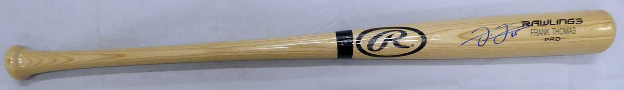 This is a Blonde Rawlings Bat that has been hand signed by Frank Thomas. This item has been certified authentic by Beckett Authentication (BAS) and comes with their sticker and matching certificate of authenticity.