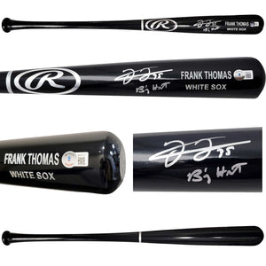 Add a Hall of Fame collectible to your MLB display with this Frank Thomas Autographed Black Rawlings Baseball Bat featuring the special inscription "Big Hurt". A Chicago White Sox legend, 2× AL MVP, and one of baseball’s most feared hitters, Frank Thomas remains one of the most sought-after autographs in the hobby.