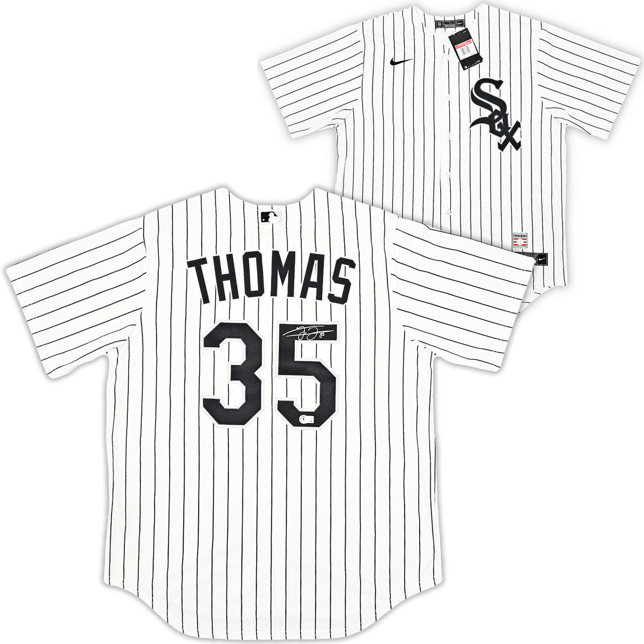 This official White Pinstripes Nike White Sox Jersey has been hand-signed by Frank Thomas with a bold, clean autograph across the numbers. The signature is authenticated by Beckett Authentication Services (BAS) under their elite Witness Program, meaning a Beckett representative personally attended and verified the signing. A BAS tamper-proof Witness hologram is included for lifetime authenticity.