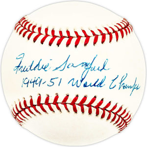 This is an Official American League Baseball that has been hand signed by Freddie Sanford. This item was inscribed "1949-51 World Champs." There is toning in the item as shown. This item is guaranteed to pass any third party authentication company including Beckett, PSA/DNA, & JSA authentication.