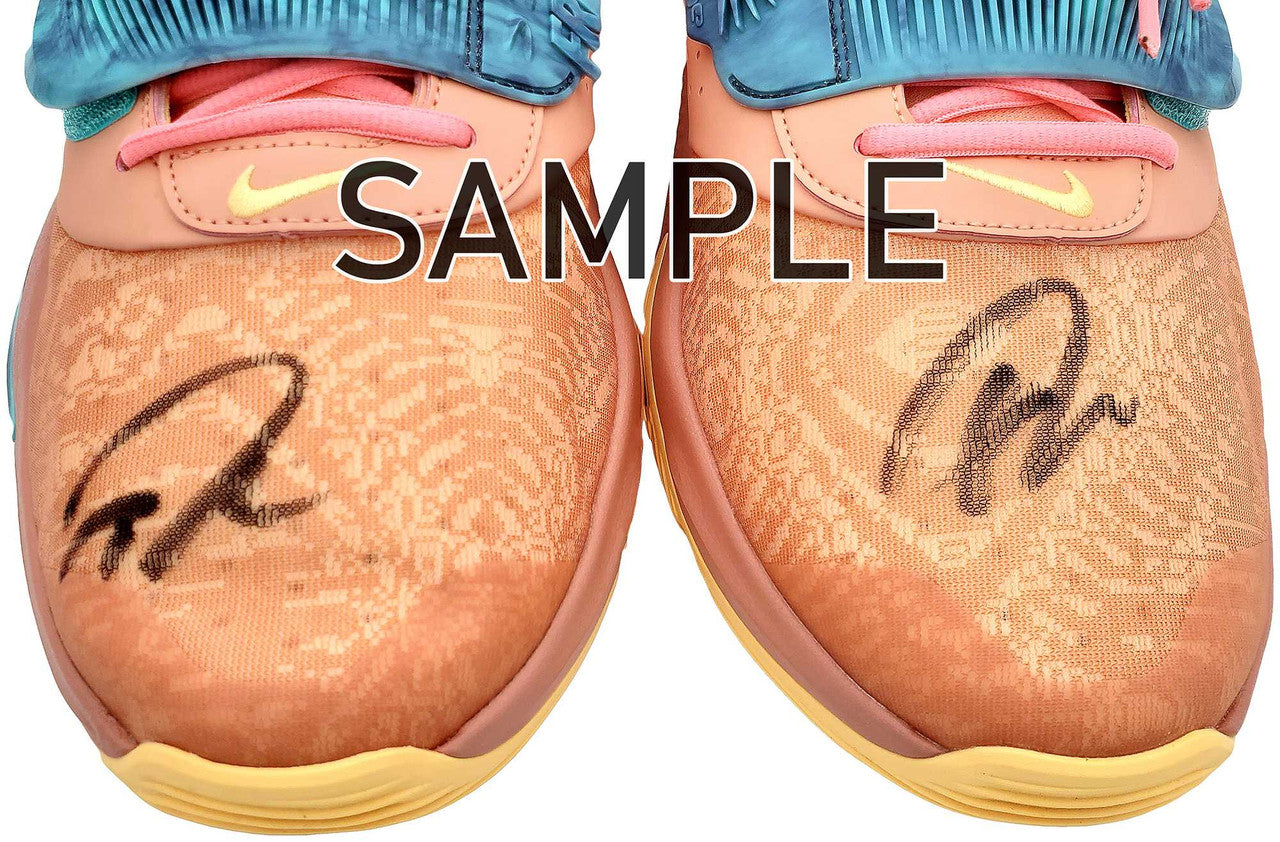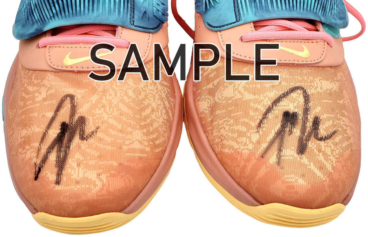 This is a pair of Crimson Bliss Nike Zoom Freak Shoes that has been hand signed by Giannis Antetokounmpo. This pair of shoes also comes with the original shoe box. This item has been certified authentic by Beckett Authentication (BAS) and comes with their tamper-proof QR Code sticker that can be verified on the Beckett-authentication.com. NOTE: This is a stock item and we have multiple quantities of this item. Giannis' signature on these shoes may vary from the original picture on this listing. We have provided a couple sample photos from other pairs of shoes of this style. After purchasing this item, please contact us and we can send you pictures of the signatures that we still have stock of.