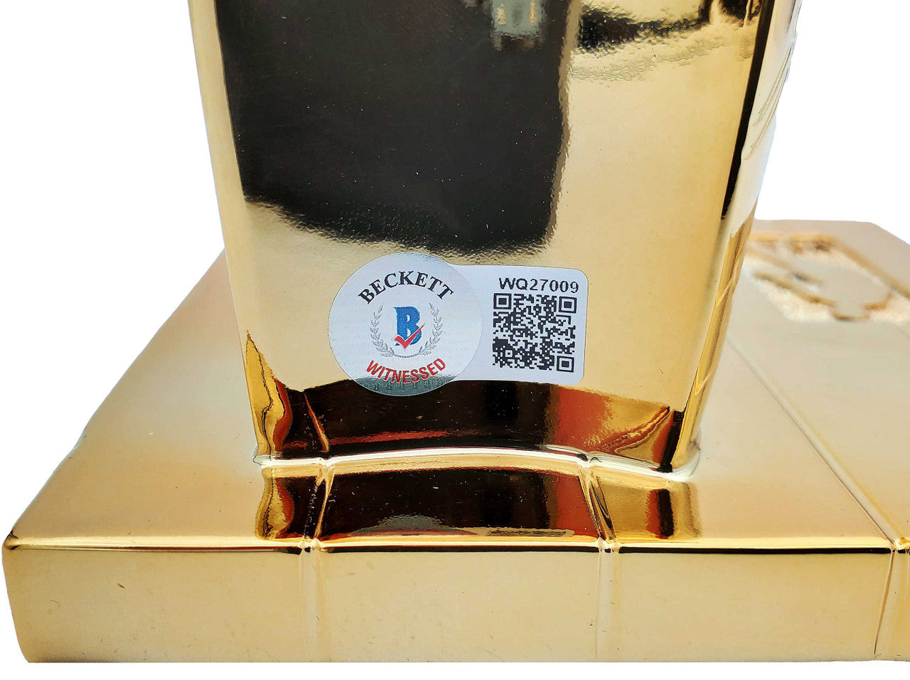 This mini trophy includes an official Beckett Authentication Services (BAS) tamper-proof QR Code sticker. The QR code can be scanned or verified directly at Beckett-authentication.com, ensuring permanent proof of authenticity.