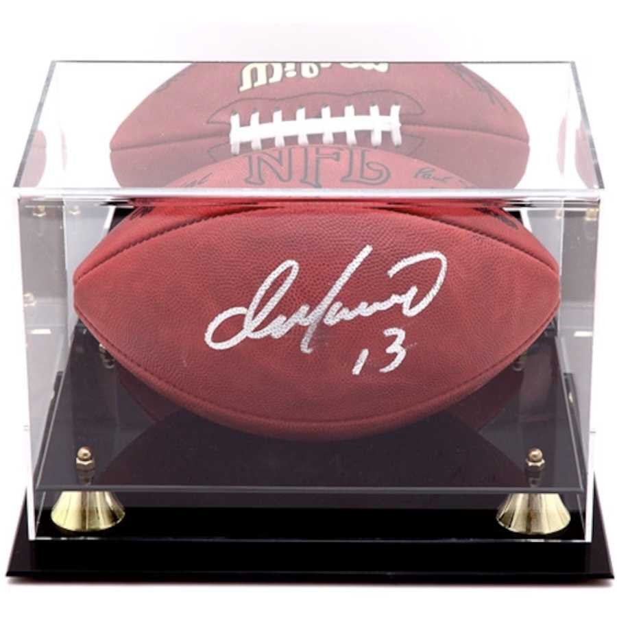The Golden Classic full-size football display case comes with a black acrylic base, gold-colored risers and a mirrored back. it's made of 1/8"-thick acrylic and features a clear acrylic lid with 70% UV protection. Perfect for displaying a collectible football. Memorabilia shown in the picture is not included. Inner measurements: W 11 3/4 in; H 8 3/4 in; D 7 in Outer dimensions: W 13 in; H 10 in; D 8 in
