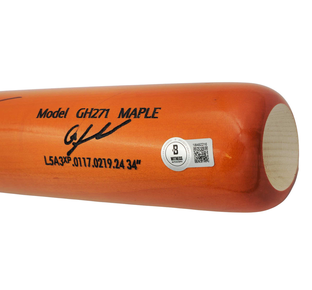 This vibrant Orange Chandler Player Model Bat has been hand-signed by Baltimore Orioles phenom Gunnar Henderson. The autograph is fully authenticated through the Beckett BAS Witness Program, meaning a Beckett representative personally observed the signing. The bat includes a tamper-proof BAS Witness hologram for lifetime verification.