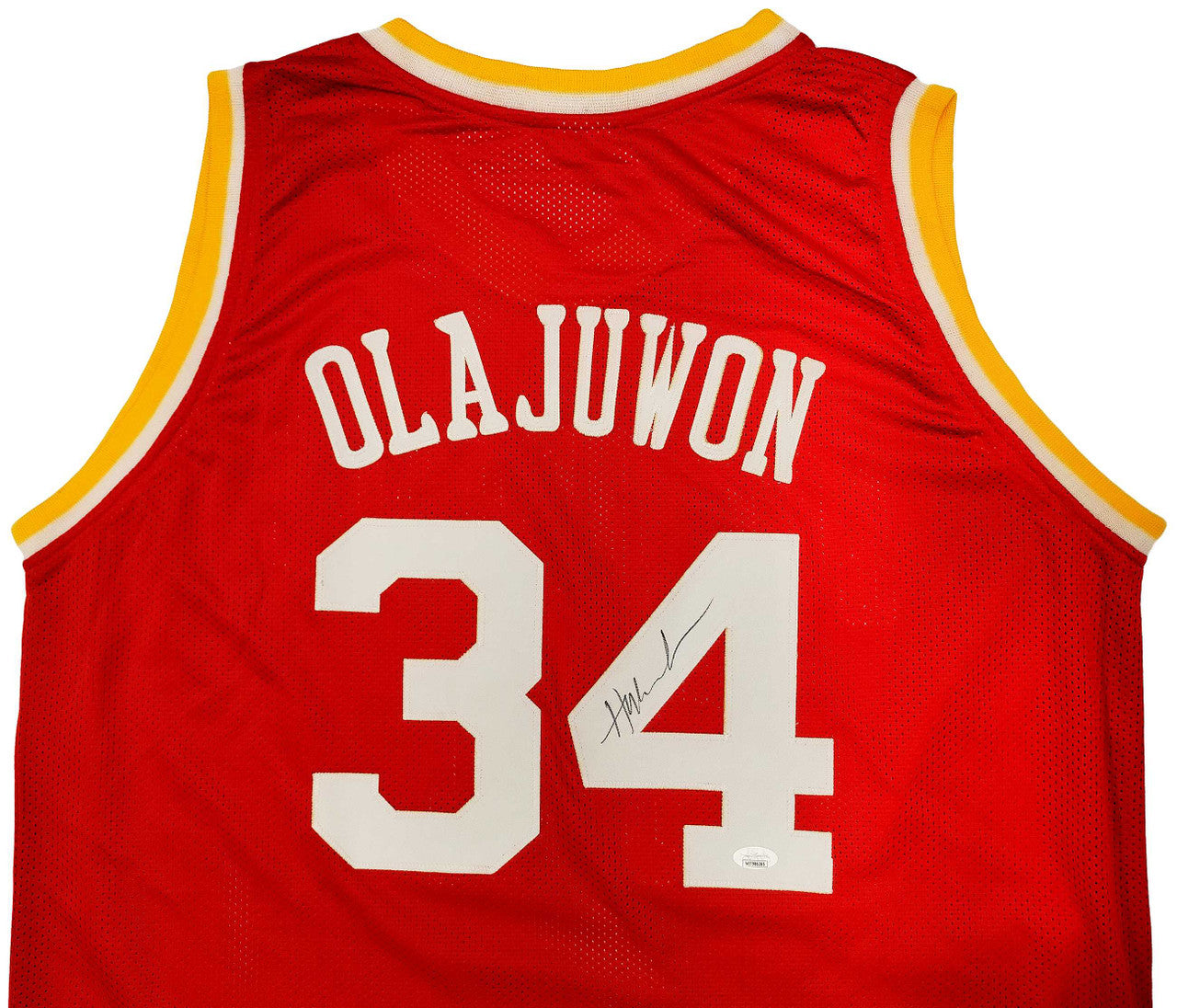 This bold Custom Red Rockets Jersey has been hand-signed by Hakeem Olajuwon. The autograph is certified by James Spence Authentication (JSA), one of the most trusted authenticators in sports memorabilia. It includes a tamper-proof JSA sticker and matching Certificate of Authenticity.