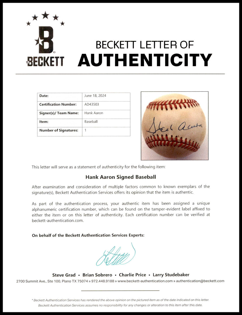 This is an Official National League Baseball that has been hand signed by Hank Aaron. There is toning in the item as shown. This item has been certified authentic by Beckett Authentication (BAS) and comes with their tamper-proof hologram and matching full-page certificate of authenticity.