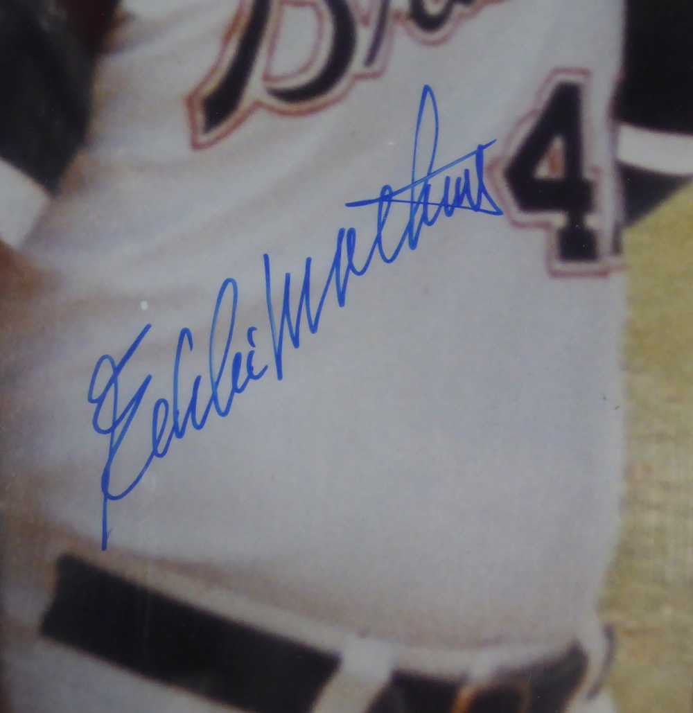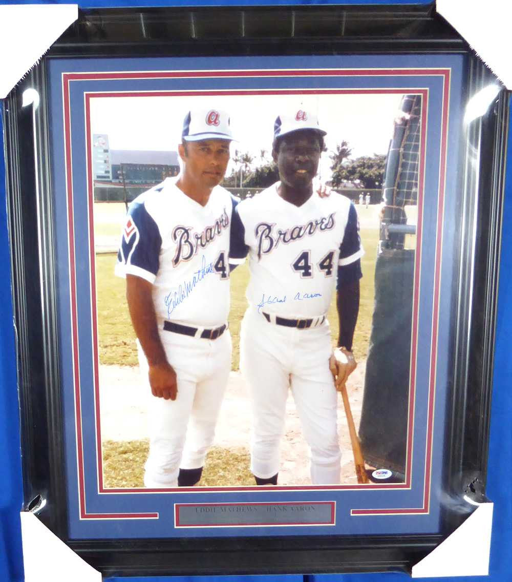 This is a framed 16x20 photo, approximately 24x28 with the frame, that has been hand signed by Hank Aaron & Eddie Mathews. It has been authenticated by PSA/DNA and comes with their sticker and matching certificate of authenticity.
