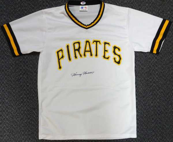 This is a Pro Knit Pittsburgh Pirates Jersey that has been hand signed by Harvey Haddix. It has been certified authentic by PSA/DNA and comes with their sticker and matching full page certificate of authenticity. The jersey is a size M.