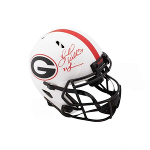 Celebrate the legendary career of a college football icon with this Herschel Walker “82 Heisman” Autographed Georgia Bulldogs Lunar Eclipse Replica Full-Size Football Helmet, authenticated by Beckett Authentication Services (BAS). Featuring the bold Lunar Eclipse alternate design with a sleek white shell and blackout facemask, this replica helmet showcases Walker’s autograph along with the rare “82 Heisman” inscription, commemorating his Heisman Trophy-winning season.