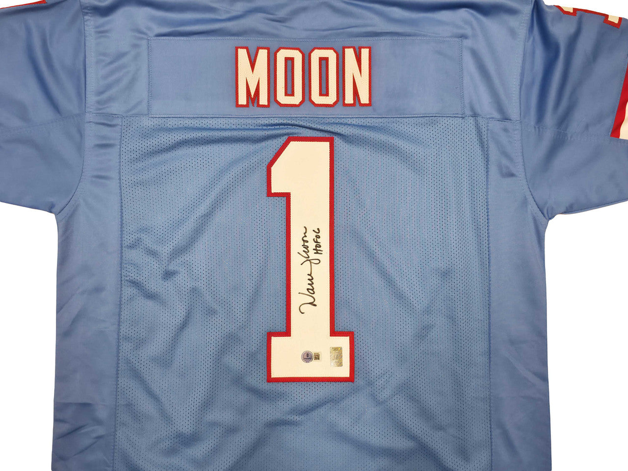 This high-quality Oilers-style custom blue jersey has been hand-signed by Warren Moon. The autograph is authenticated by Beckett Authentication Services (BAS) and includes their QR Code tamper-proof hologram, allowing instant online verification.