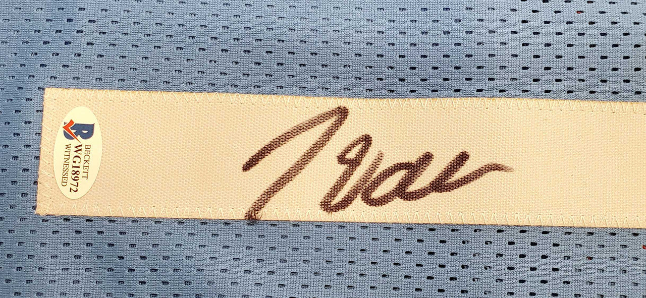 This is a Light Blue Custom Jersey that has been hand signed by John Wall. This is a custom jersey with no name brand. The approximate size is XL. It has nice sewn in name and numbers. This item has been certified authentic by Beckett (BAS) and comes with their tamper-proof sticker and matching certificate of authenticity.