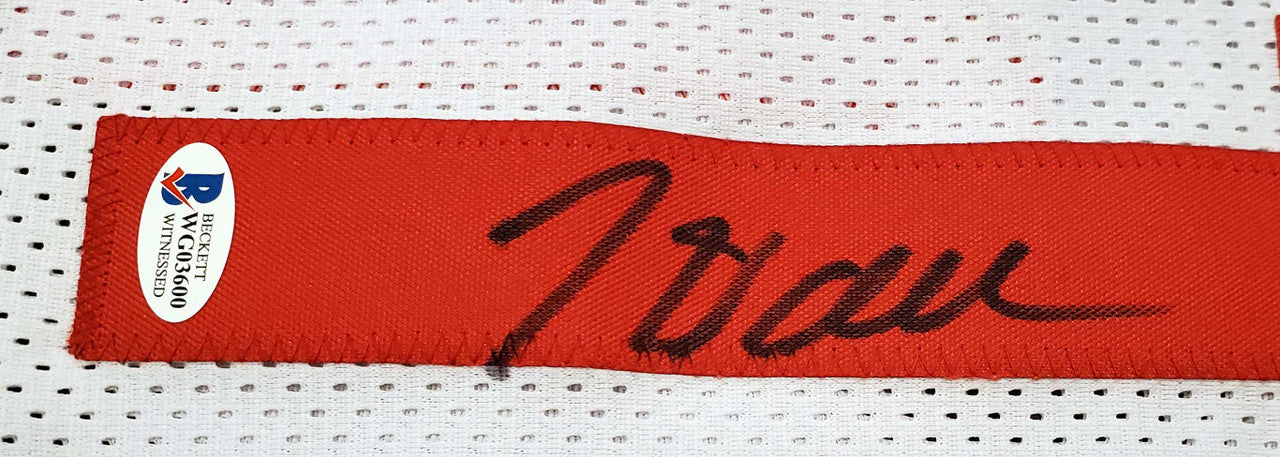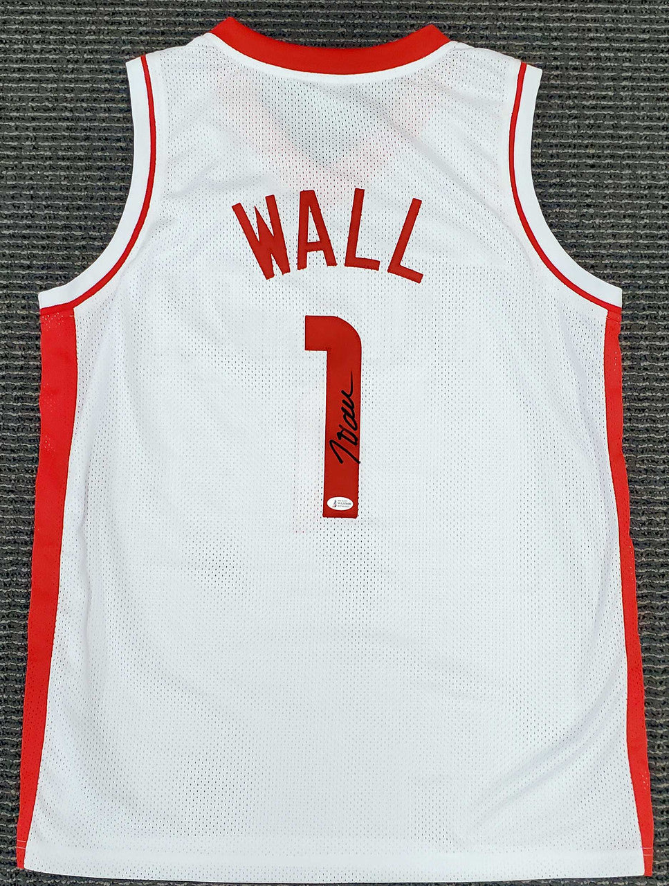 This is a White Custom Jersey that has been hand signed by John Wall. This is a custom jersey with no name brand. The approximate size is XL. It has nice sewn in name and numbers. This item has been certified authentic by Beckett (BAS) and comes with their tamper-proof sticker and matching certificate of authenticity.
