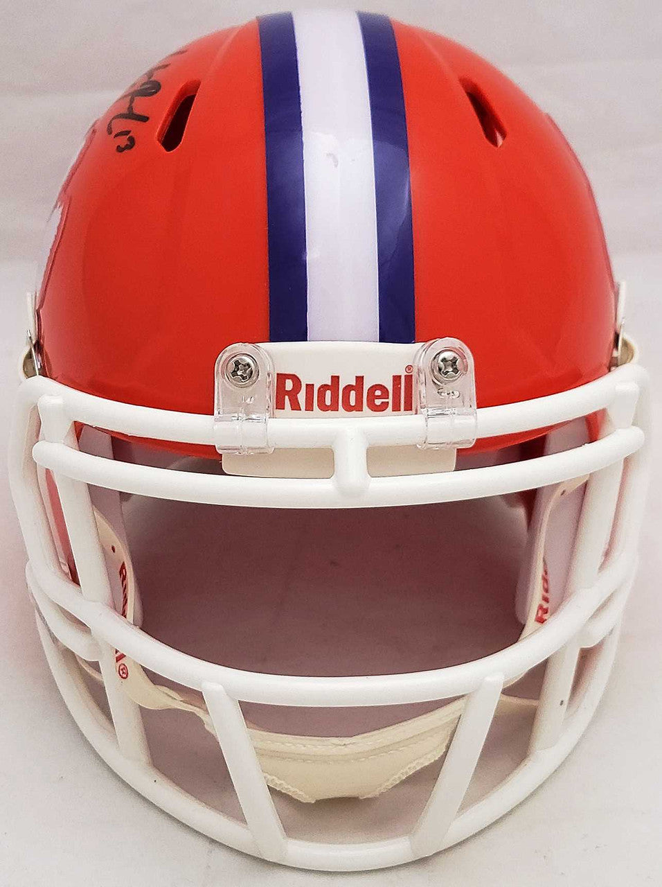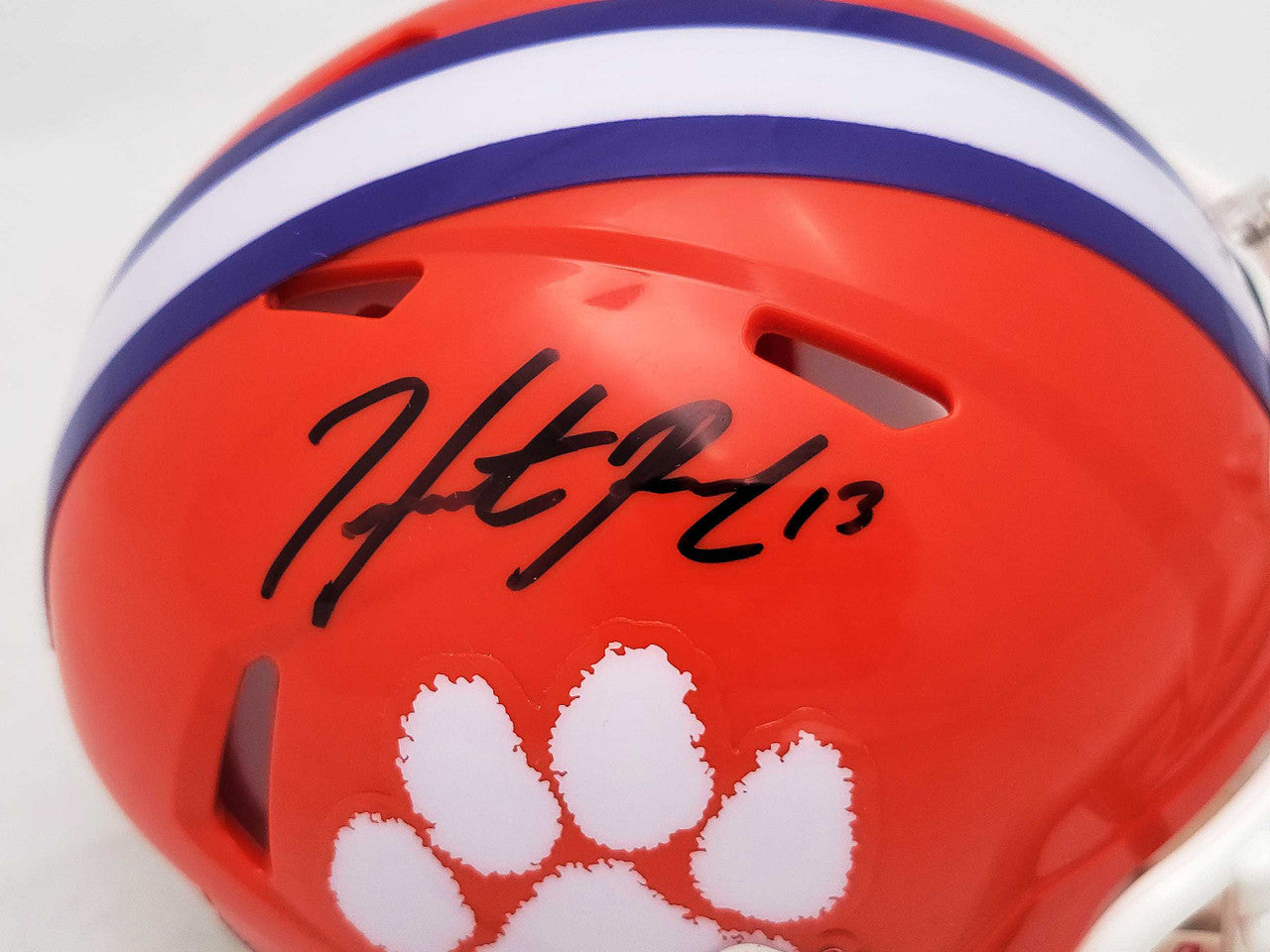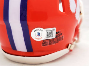 This is a Clemson Tigers Orange Speed Mini Helmet that has been hand signed by Hunter Renfrow. This item has been certified authentic by Beckett Authentication (BAS) and comes with their tamper-proof QR Code sticker that can be verified on the Beckett-authentication.com.